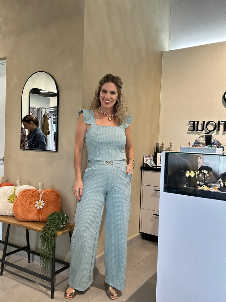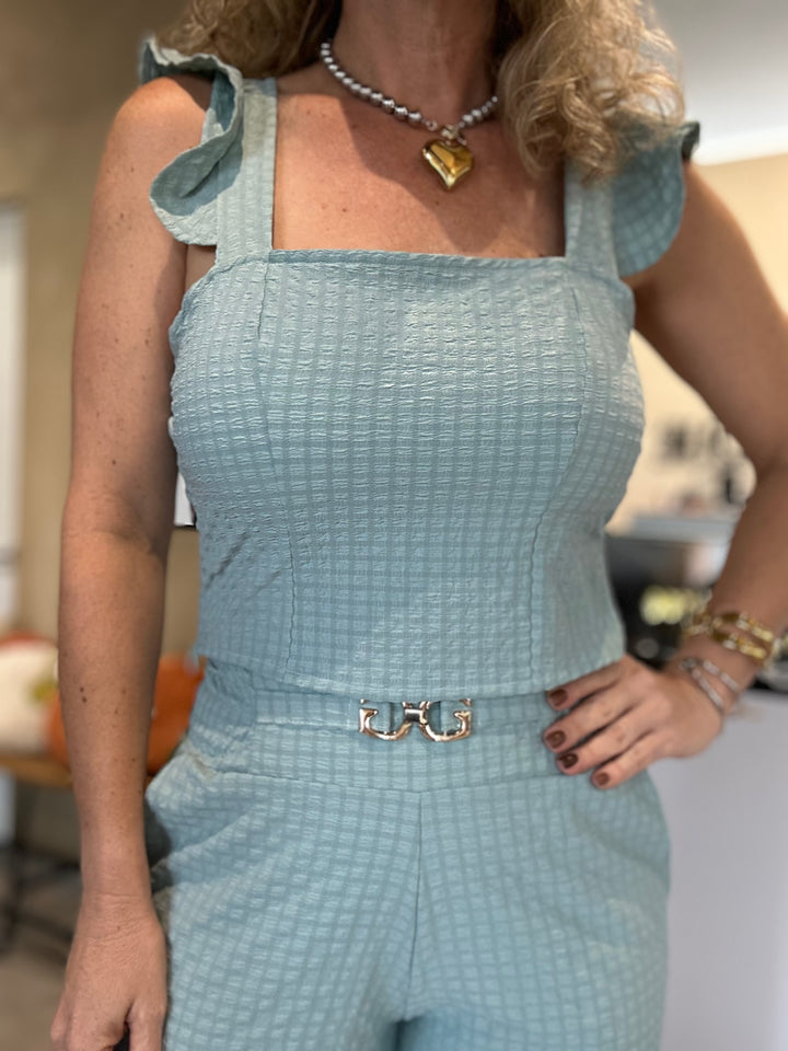 Set colombiano confeccionado en una delicada tela texturizada tipo gaufre, compuesto por top estructurado con volantes en los hombros y pantalón de pierna amplia con caída ligera. Su tono verde menta evoca frescura y serenidad, ideal para los días soleados o eventos casuales con un aire sofisticado.