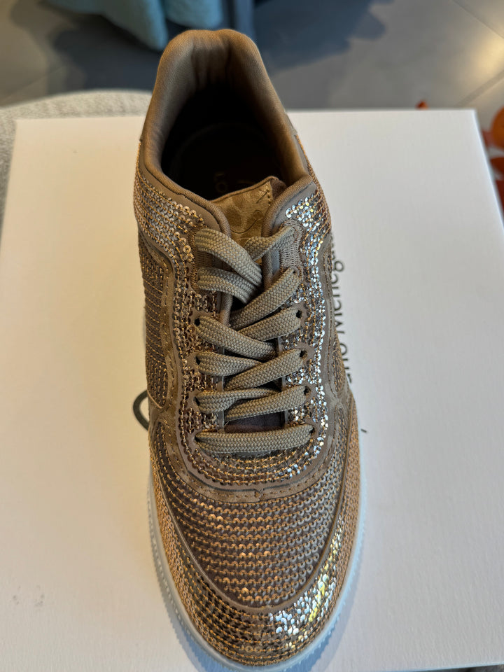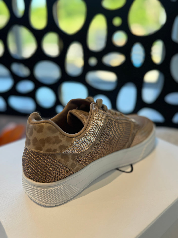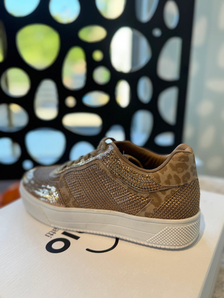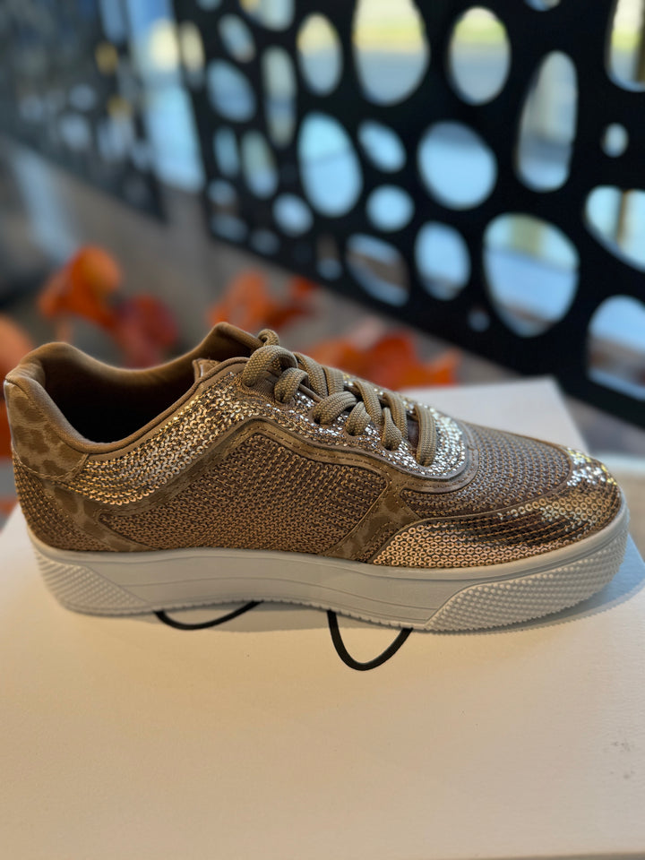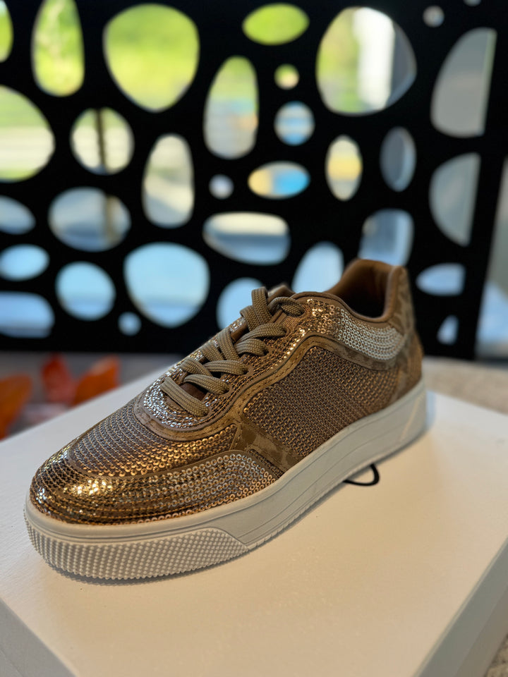 Sneaker en tono rose gold, con un diseño brillante y sofisticado que combina comodidad y glamour. Su superficie con delicadas lentejuelas crea un efecto luminoso ideal para elevar cualquier outfit casual o de viaje.