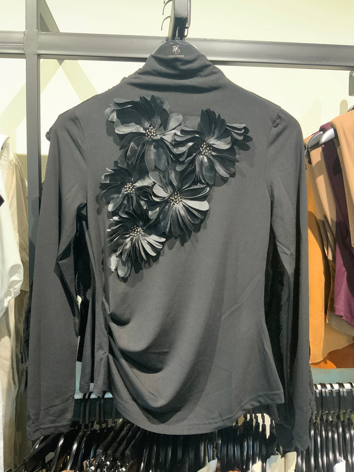 Un básico negro que nunca volverá a ser básico. La Black Orchid Drama Top es la blusa que eleva cualquier look con su espectacular espalda: tres grandes flores 3D de cuero vegano negro mate, aplicadas a mano y con centros de perlas doradas que captan la luz con cada movimiento.