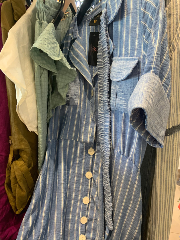 Traje maxi de la línea colombiana, confeccionado en una tela suave con delicadas rayas verticales que estilizan la figura. Incluye cinturón a juego para definir la cintura y aportar un toque de elegancia relajada. Perfecto para un look fresco y sofisticado, ideal tanto para el día como para la tarde.