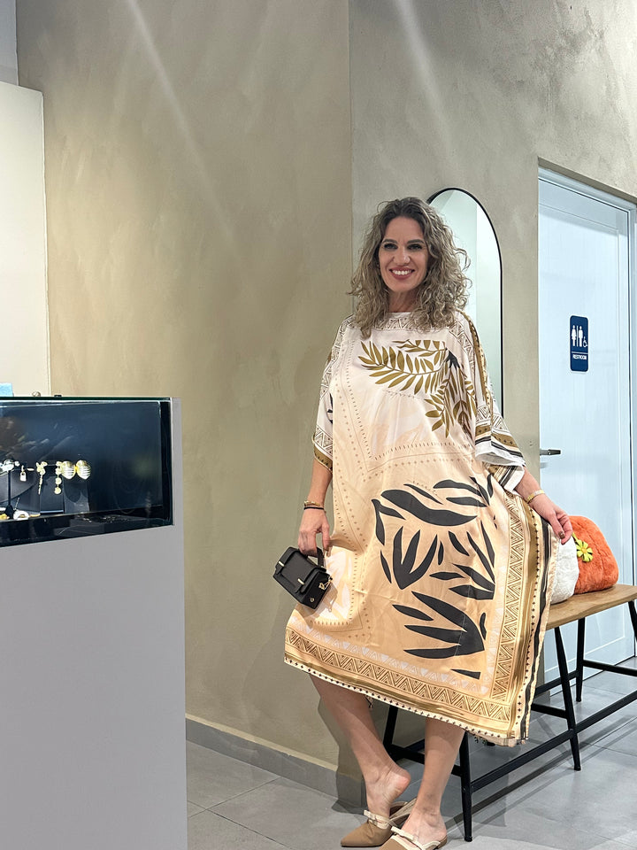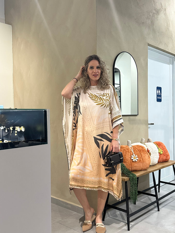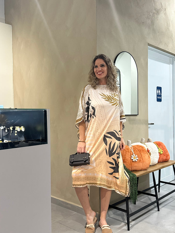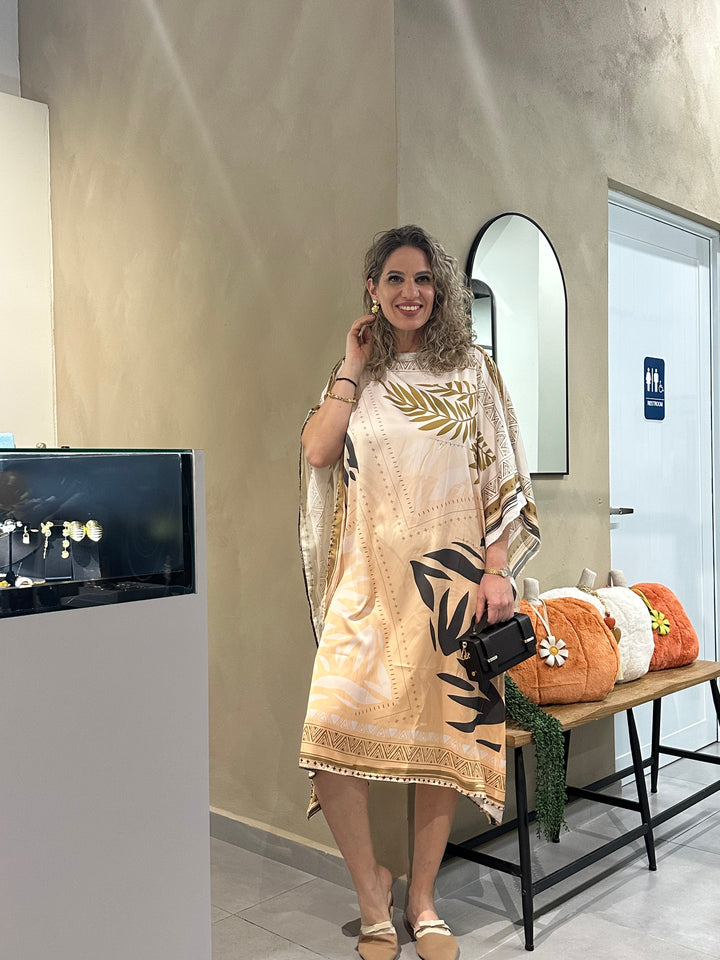 Traje corto con estampado en tonos vino y rosado que combina frescura y elegancia. Su silueta amplia estilo túnica ofrece comodidad y movimiento, mientras que el diseño geométrico y botánico aporta un aire moderno y sofisticado. Confeccionado en Colombia, es ideal para un look chic de día o una salida veraniega con estilo.