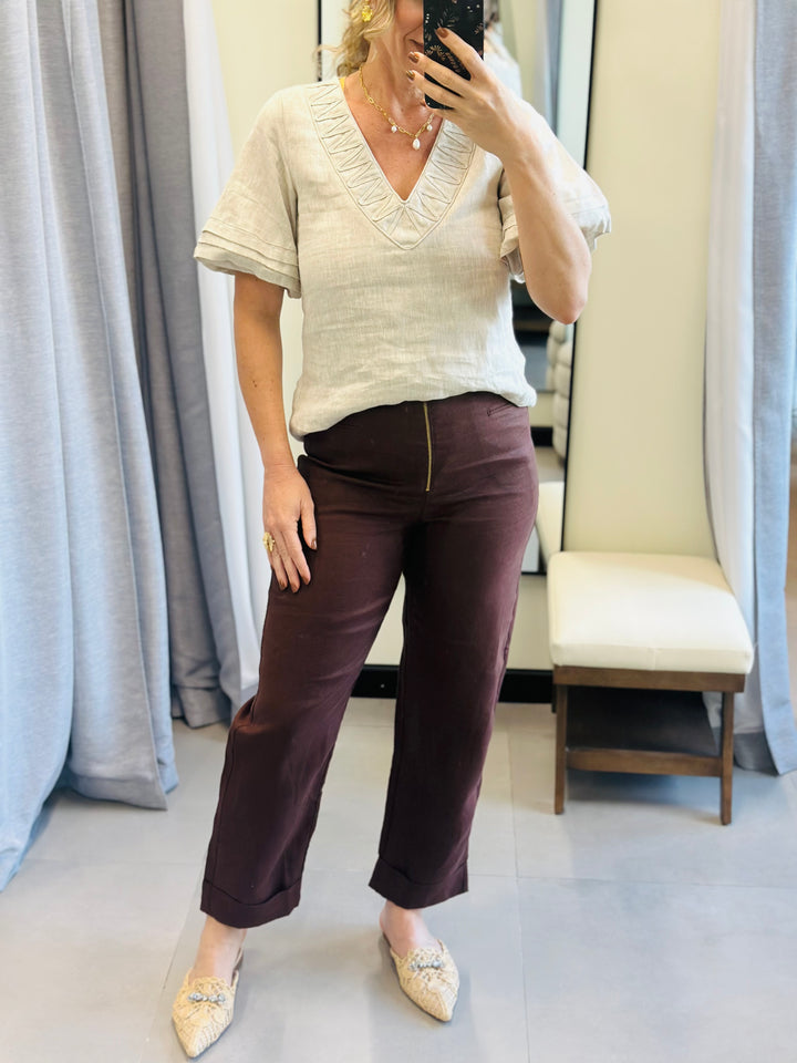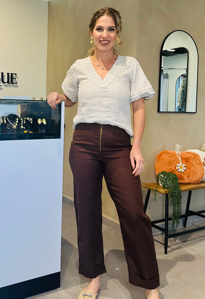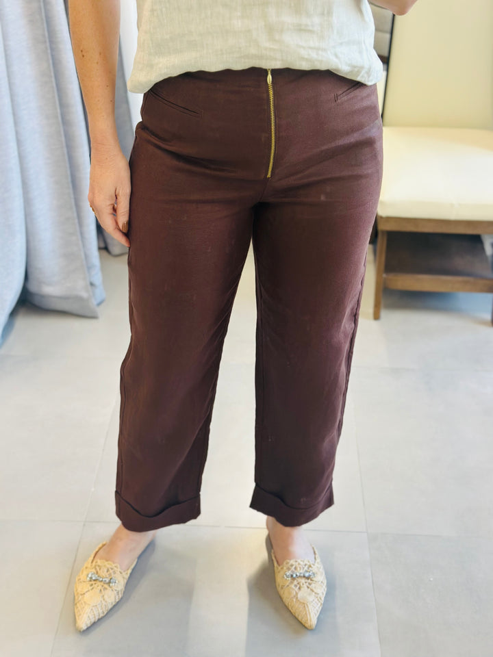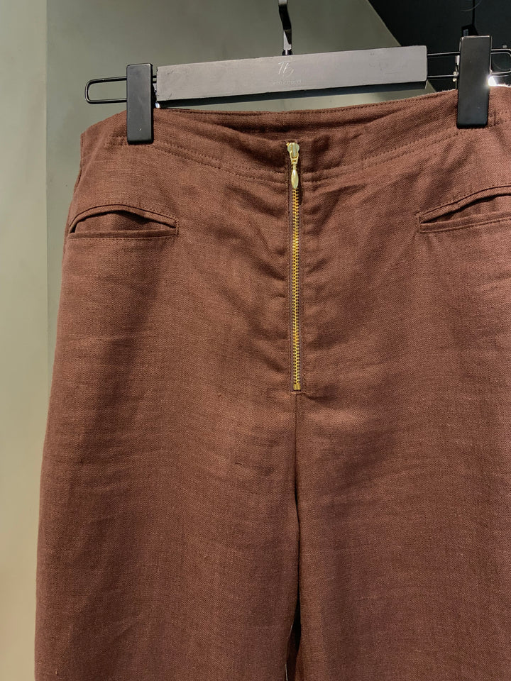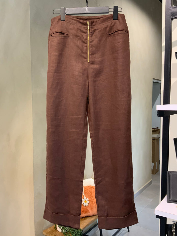 Pantalón confeccionado en lino de tono chocolate con cierre frontal dorado que añade un toque de elegancia sutil. Su caída recta y dobladillo ancho crean una silueta moderna y estilizada, perfecta para looks tanto casuales como de oficina.
