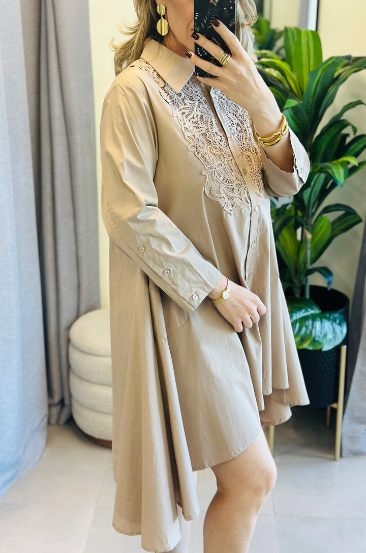 La camisa que se viste de vestido y conquista. La Camel Lace Queen Shirt Dress es esa pieza 10/10 que funciona como vestido corto o como camisa larga oversized según el día y el mood.