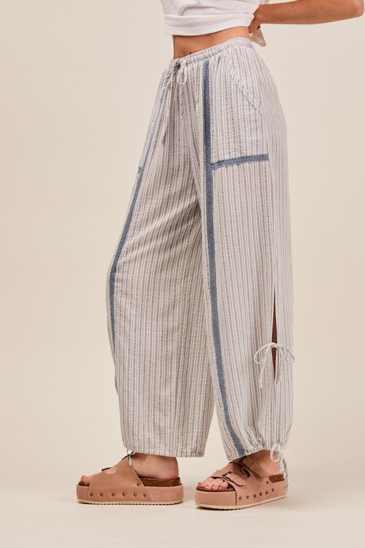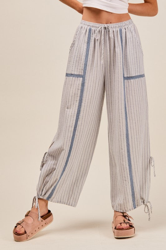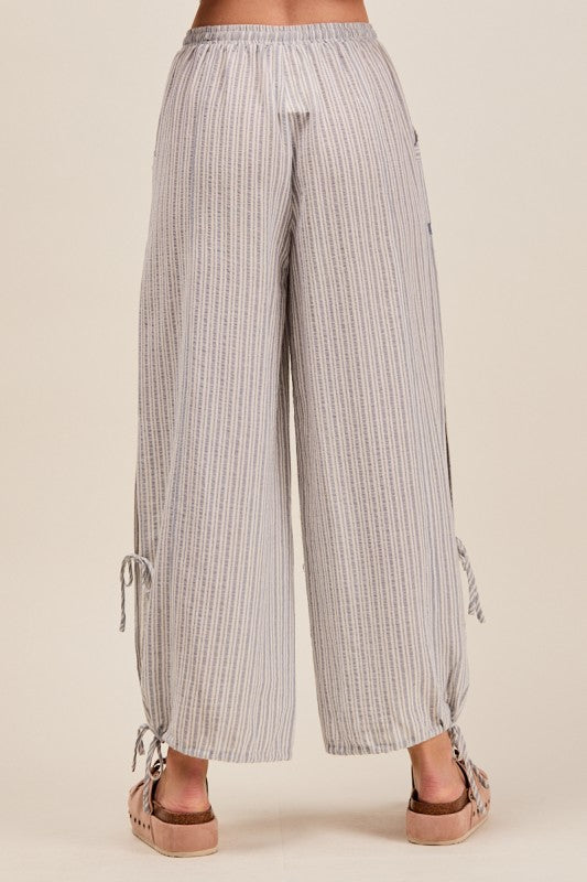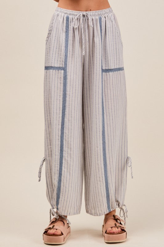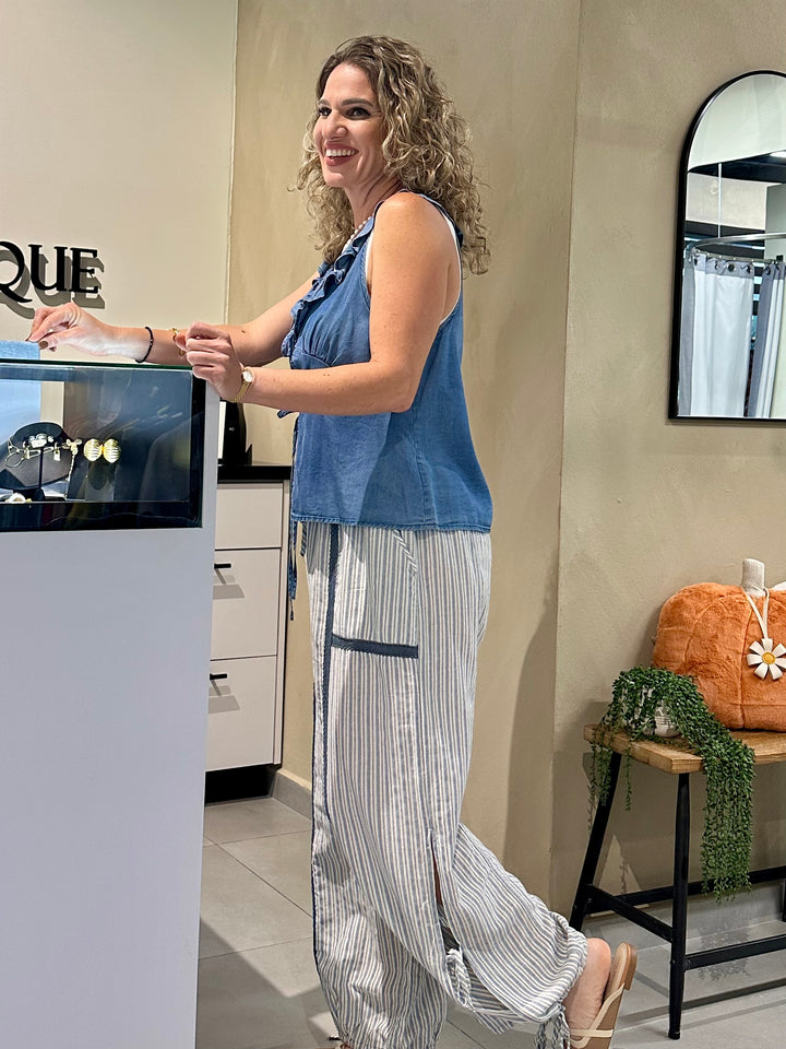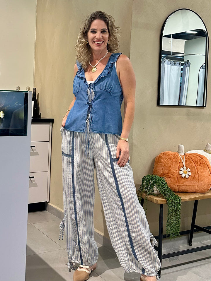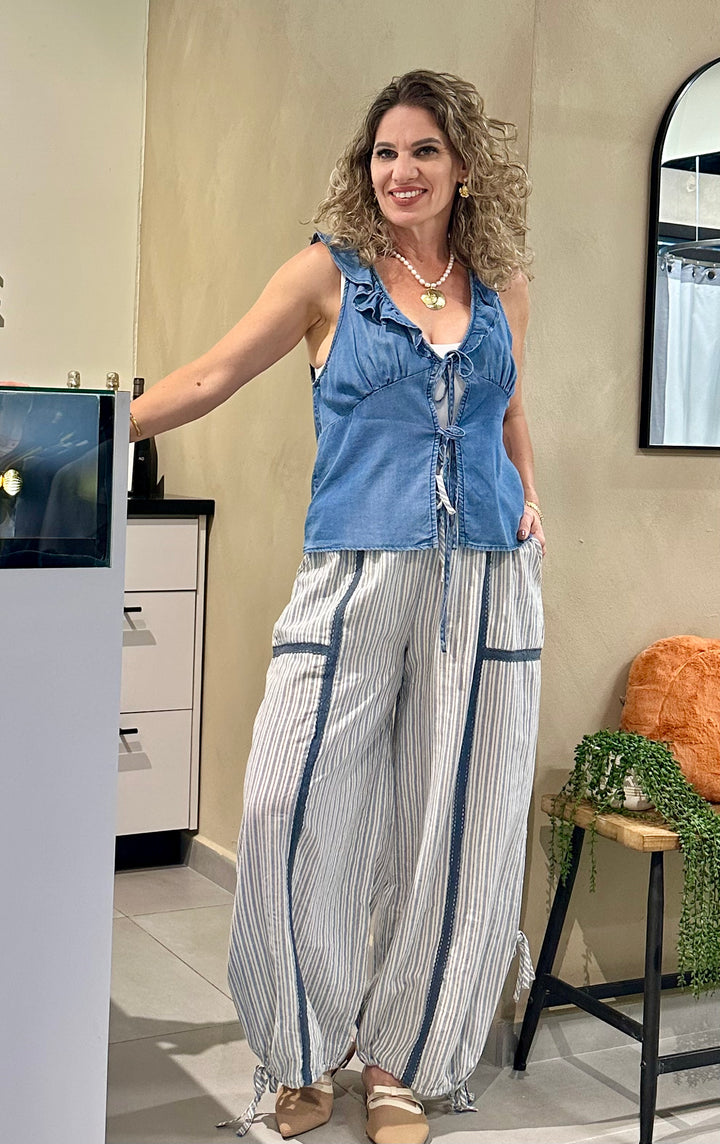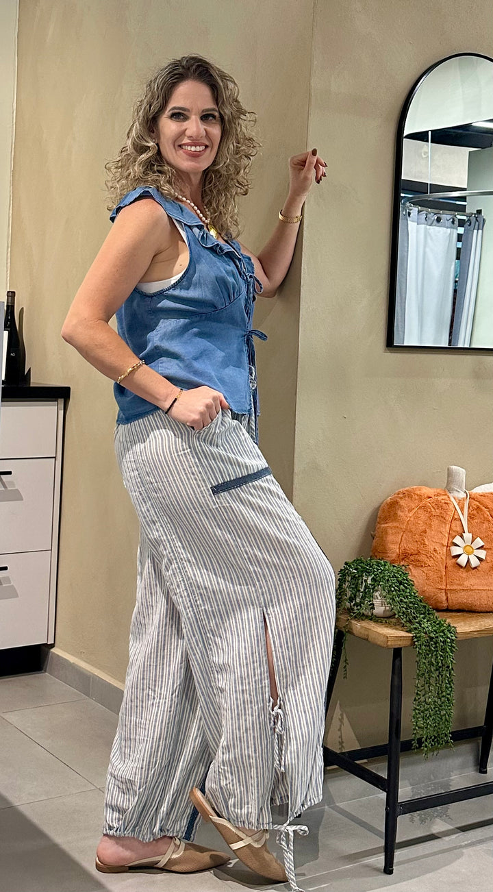 Pantalón palazzo con estampado de rayas en tonos azul y blanco, acentuado con delicados detalles en encaje que realzan su diseño artesanal. Su tela ligera y fluida ofrece frescura y comodidad, ideal para crear looks elegantes con un aire relajado y natural.