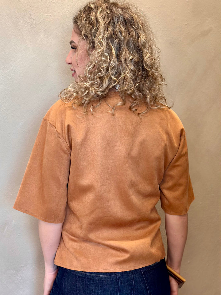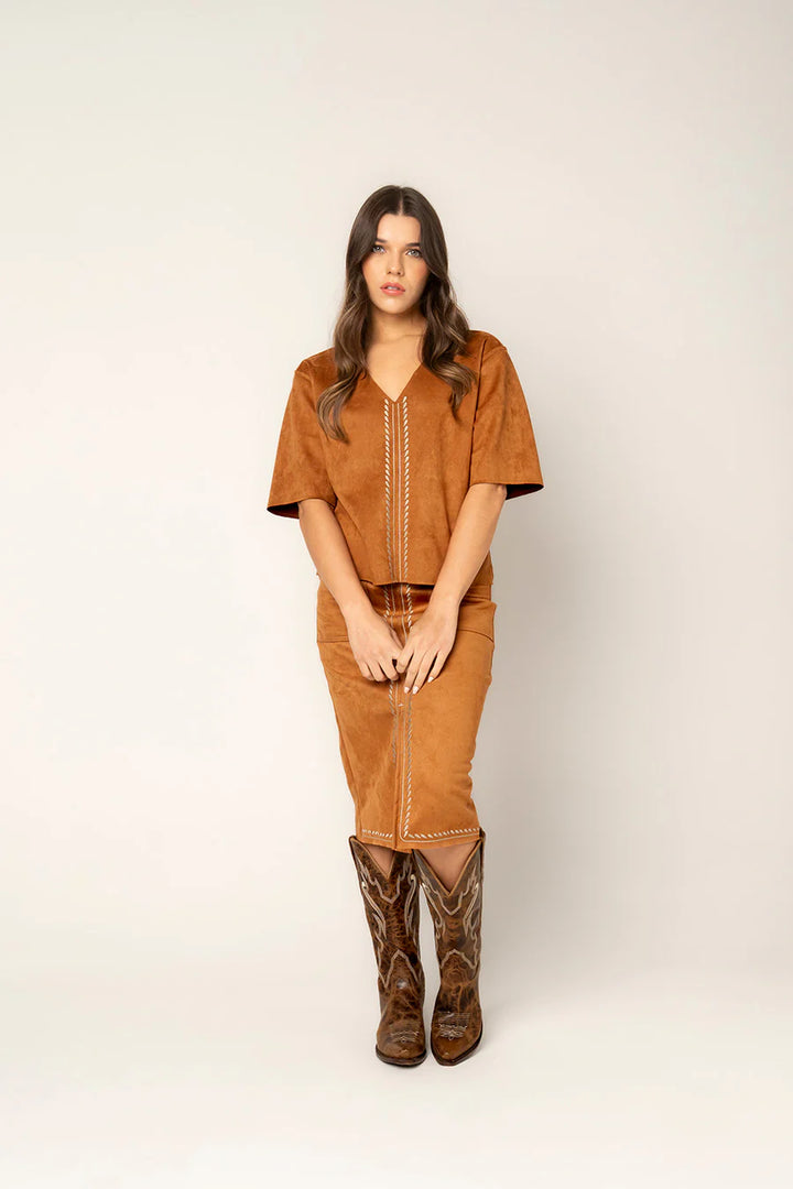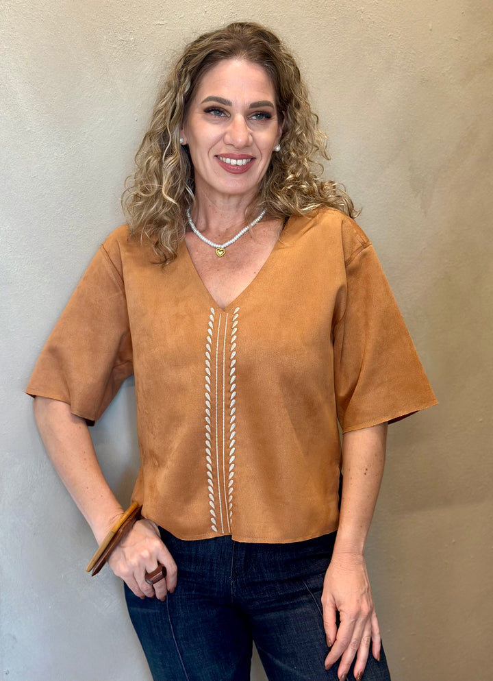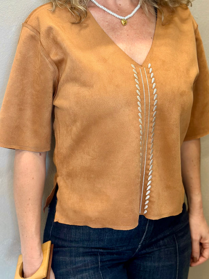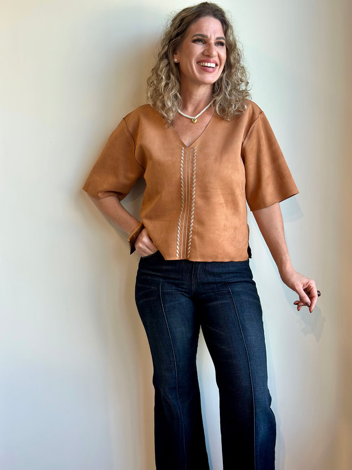 Top en tono cobre con escote en “V” y delicado bordado lineal al frente. Confeccionado en Colombia, refleja minimalismo sofisticado y es ideal para un look elegante, moderno y versátil.