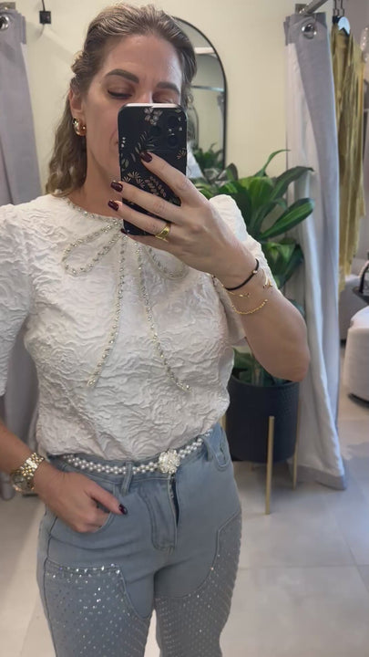 Jeans anchos en denim azul claro con detalles de cristales brillantes en piernas y bolsillos, para un toque glam casual. Corte holgado y cómodo que estiliza la figura con elegancia effortless.