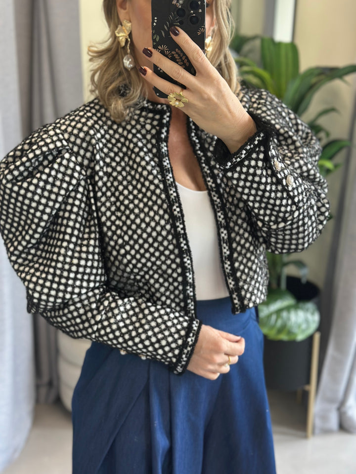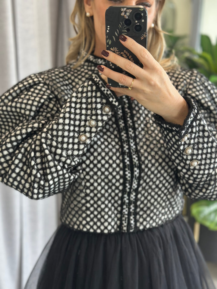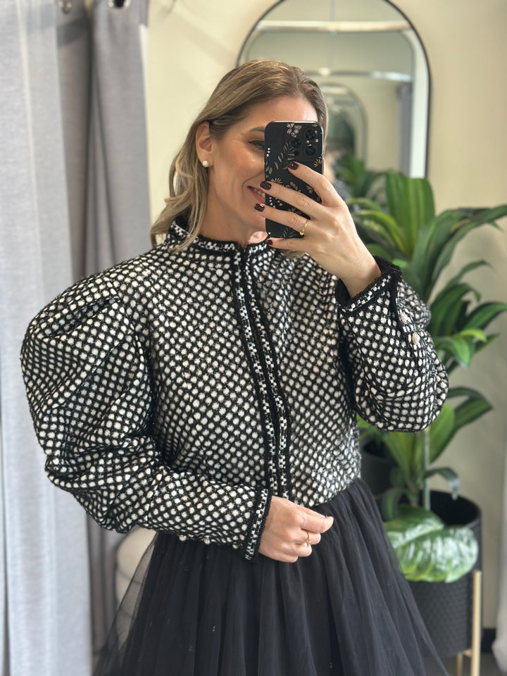 El top-chaqueta que todas van a querer. La Dalmata Queen Cropped Jacket es la pieza perfecta para elevar cualquier look: torera corta de tweed blanco y negro con estampado dálmata oversized, mangas abullonadas con volumen dramático y cierre frontal con cremallera plateada joya.
