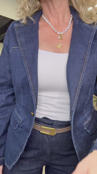 Ligera pero con estructura, versátil y timeless – ideal para looks chic y modernos: combínala abierta sobre tops crop, blusas fluidas o camisetas; o cerrada con pantalones palazzo, jeans de tiro alto, faldas midi o shorts para oficina elegante, brunch, citas, eventos semi-formales o salidas urbanas. Una pieza esencial que suma sofisticación effortless, contraste dorado y estilo denim con toque luxury.