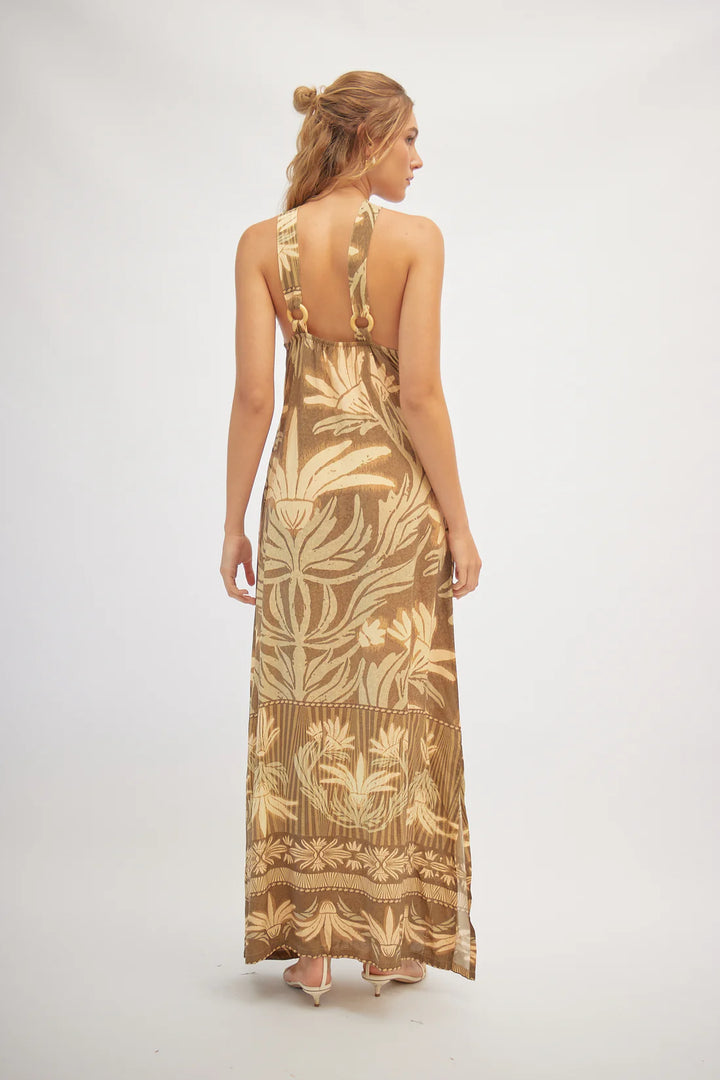 Vestido largo en tonalidades verdes con estampado artístico que aporta un aire contemporáneo y sofisticado. Su diseño sin mangas con cuello amplio y caída fluida rematada en volantes lo convierte en una pieza fresca y elegante. Confeccionado en Colombia, es perfecto para un look distintivo que une comodidad y estilo artesanal.