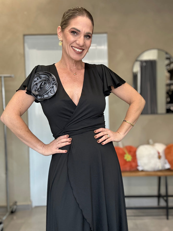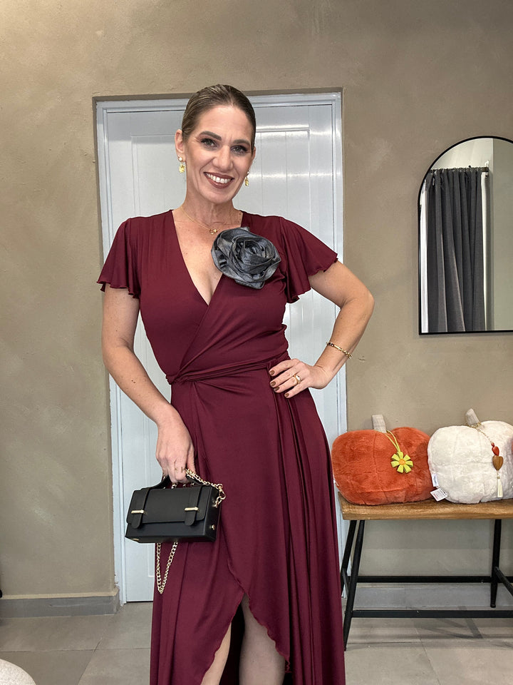 Vestido cruzado de corte asimétrico con caída fluida y movimiento elegante. Su diseño resalta la silueta con un lazo lateral y detalle floral removible que aporta un toque sofisticado y femenino. Disponible en negro clásico y vino profundo, dos tonos atemporales que transmiten elegancia sin esfuerzo. Ideal para eventos, cenas o celebraciones especiales.