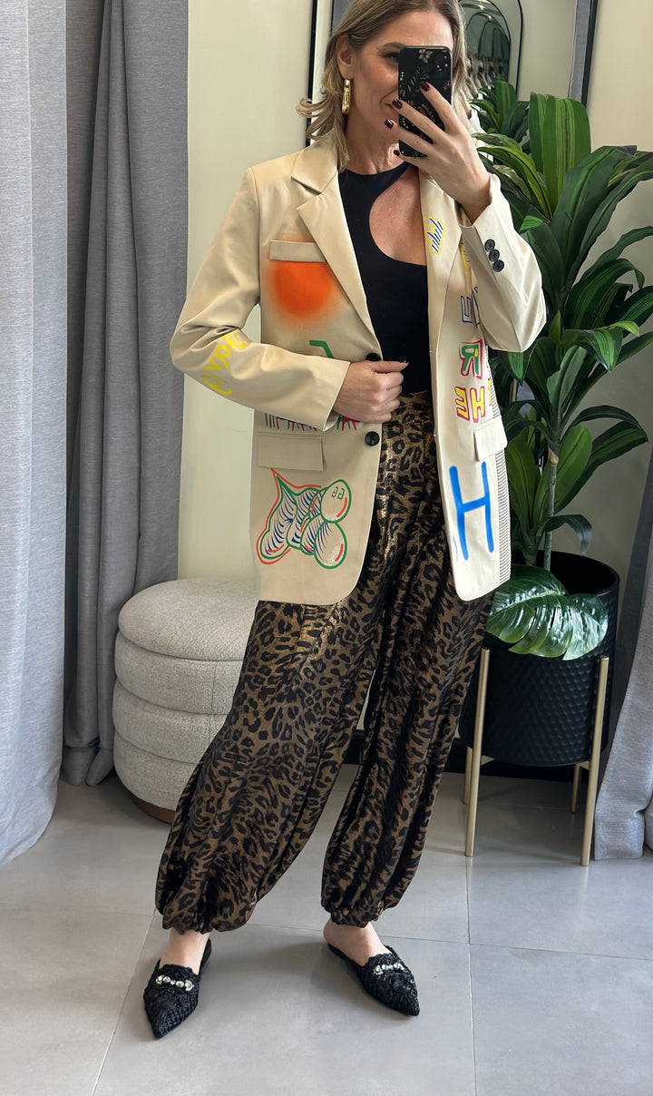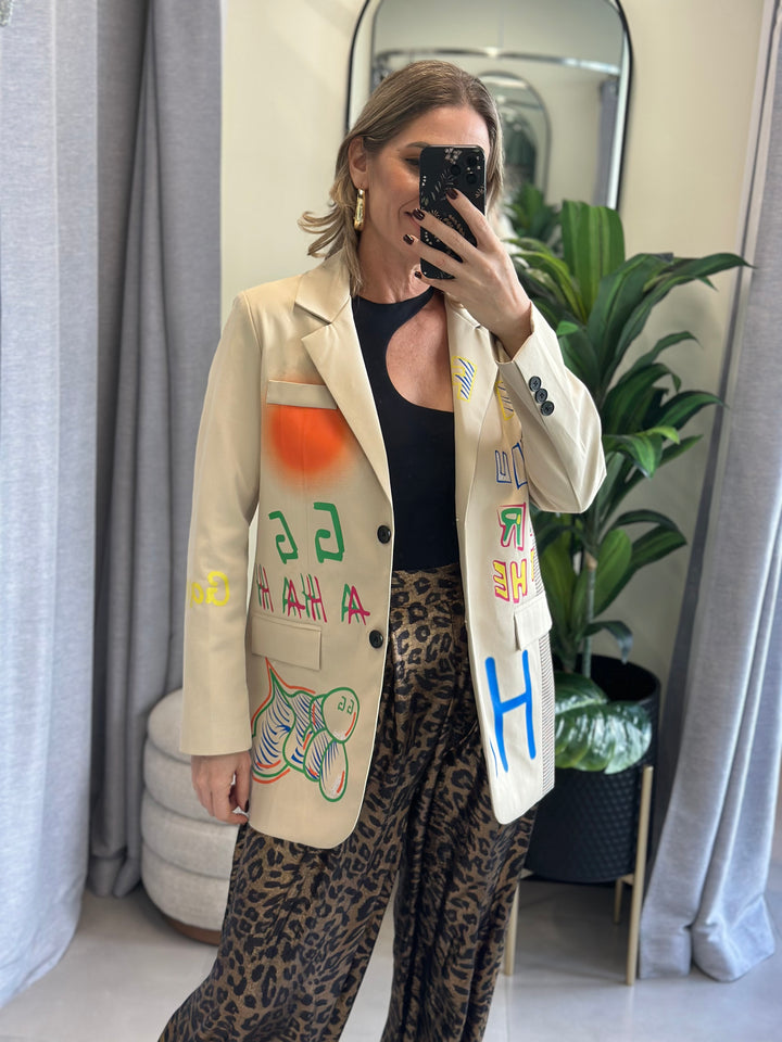 La Go For The Glam Graffiti Blazer es la pieza definitiva para quien no quiere pasar desapercibida: blazer blanco roto oversized, pintado a mano con frases motivadoras y dibujos en colores neón (amarillo, naranja, verde, rosa, azul…), spray degradado naranja y detalle de vichy negro en un lateral.