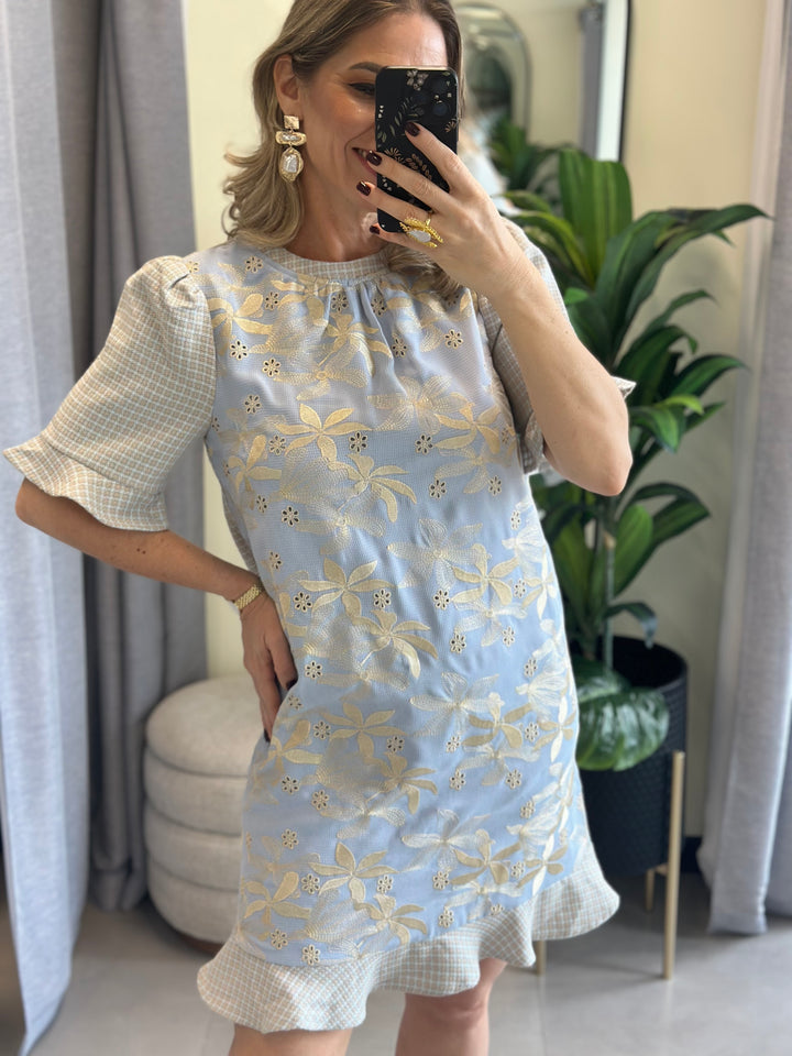 Un sueño en azul cielo y oro. El Golden Blossom Voy Dress es la definición de elegancia romántica con toque couture, perfecto para eventos especiales, bodas de día, comuniones o cualquier ocasión en la que quieras brillar con luz propia.