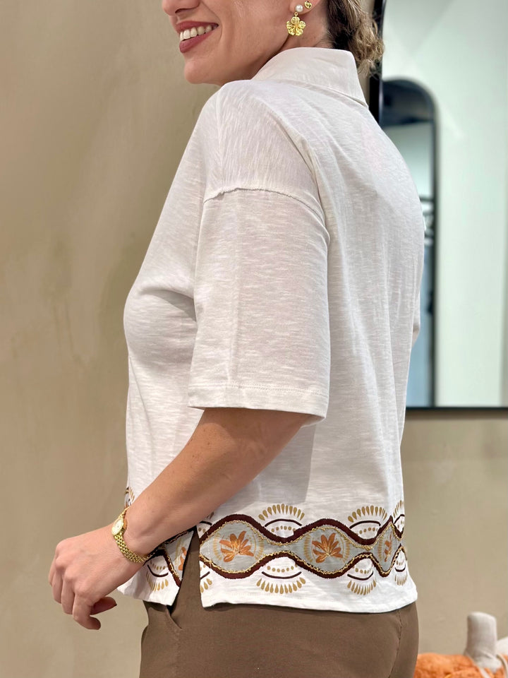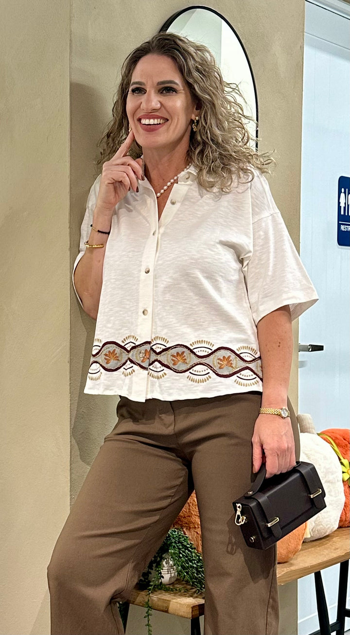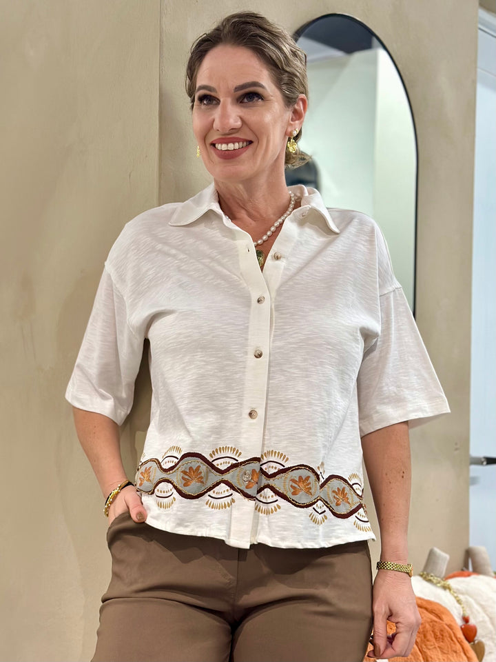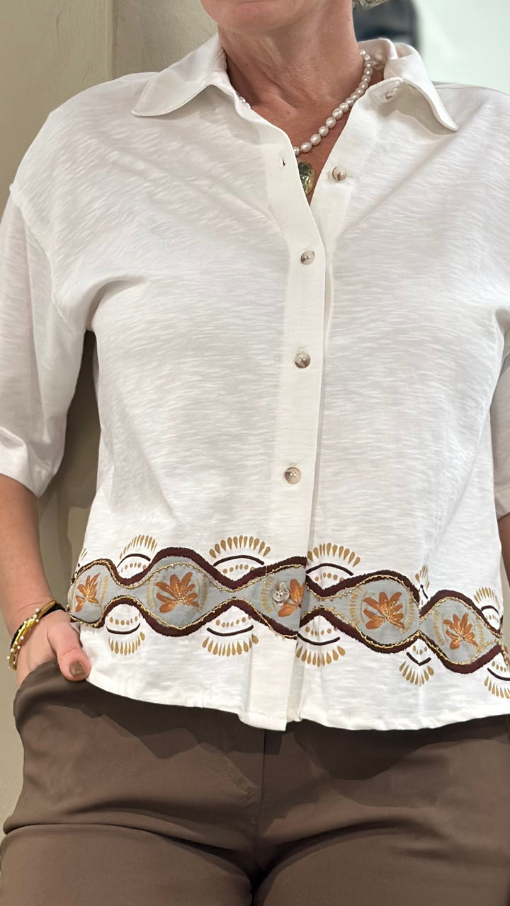 Camisa en tono marfil con bordado artesanal en el ruedo que combina motivos florales y geométricos. Confeccionada en Colombia, une tradición y modernidad en una pieza versátil que aporta elegancia natural a cualquier ocasión.