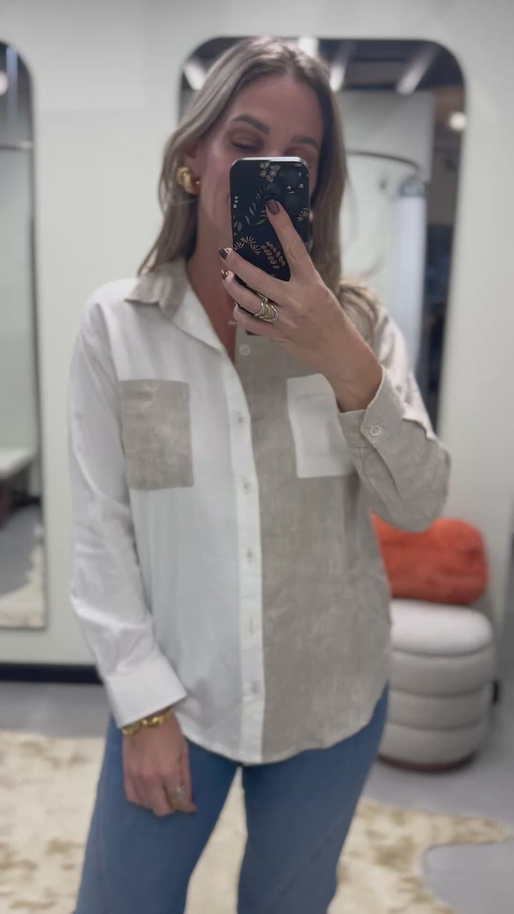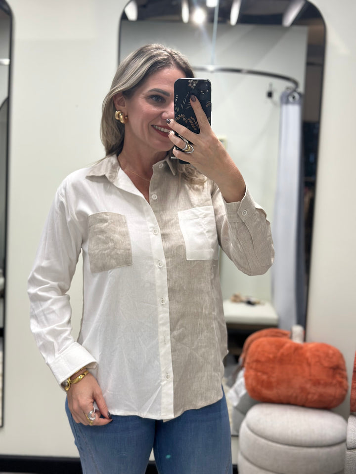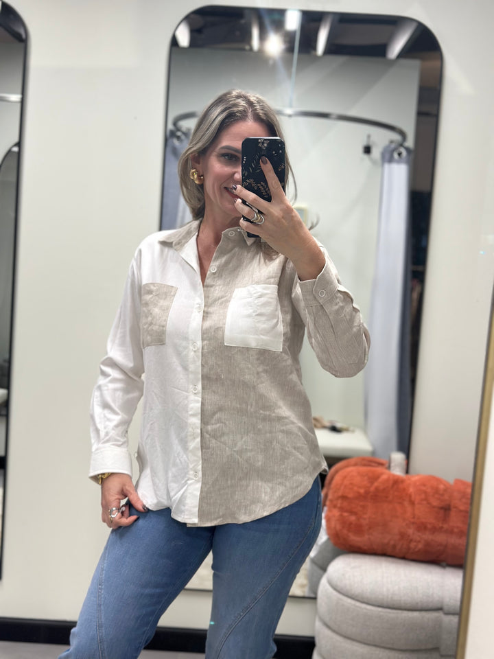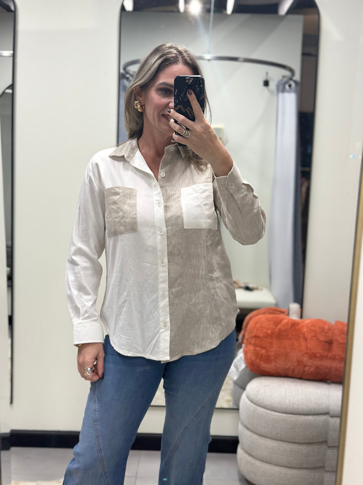 Blusa colombiana en lino, de diseño bicolor que combina tonos naturales con blanco puro, creando un contraste elegante y versátil. Su corte relajado y bolsillos frontales aportan un aire contemporáneo y sofisticado, ideal para un look fresco y refinado tanto de día como de tarde
