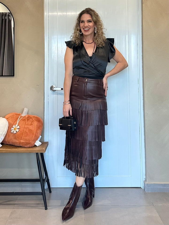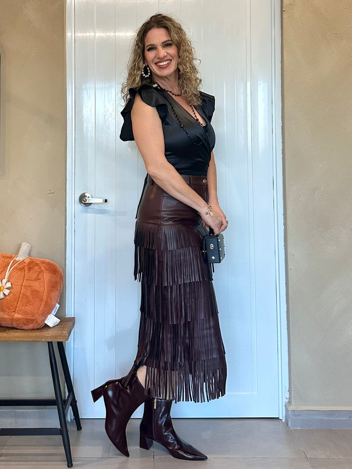 Falda en cuero negro de tacto suave y corte impecable, con capas de flecos que fluyen en cascada para un movimiento sofisticado y lleno de actitud. Disponible también en un intenso tono burgundy.