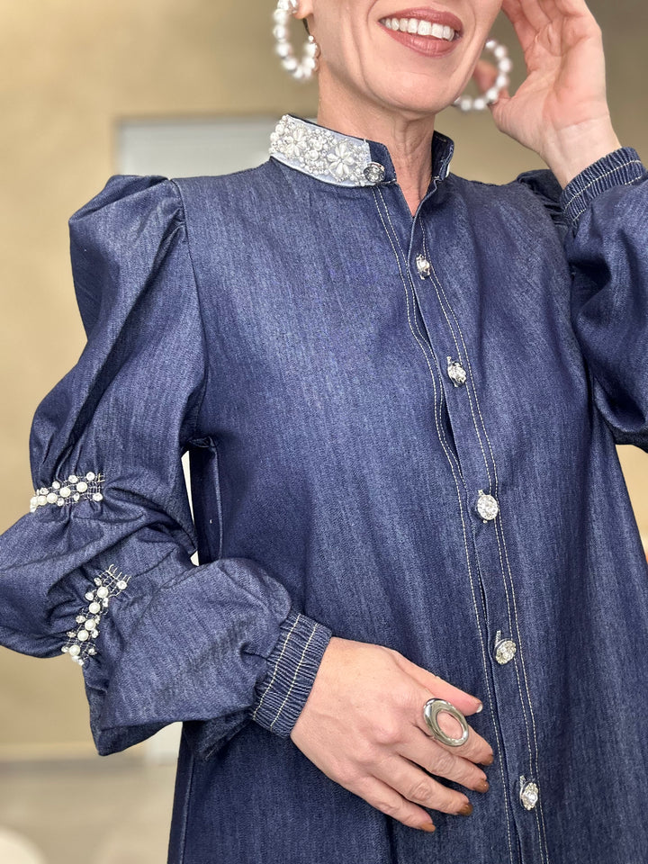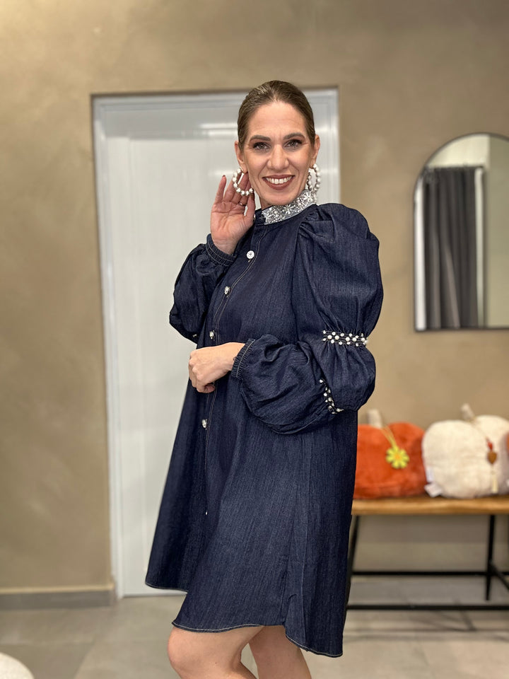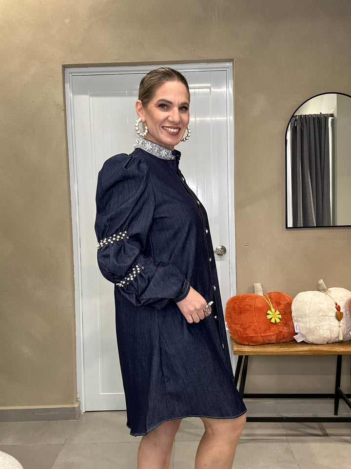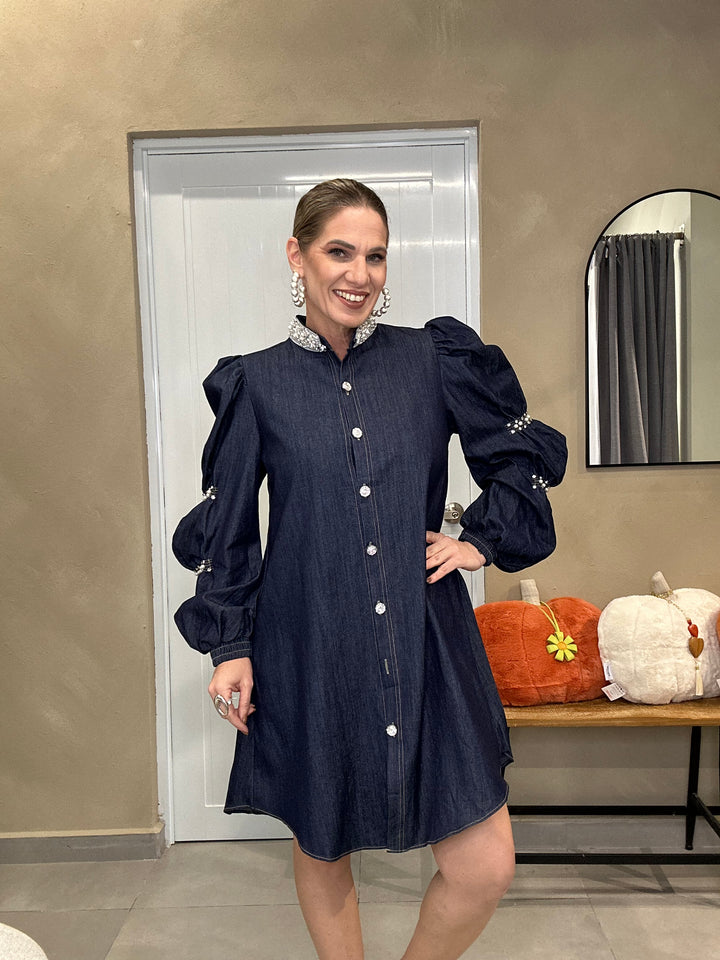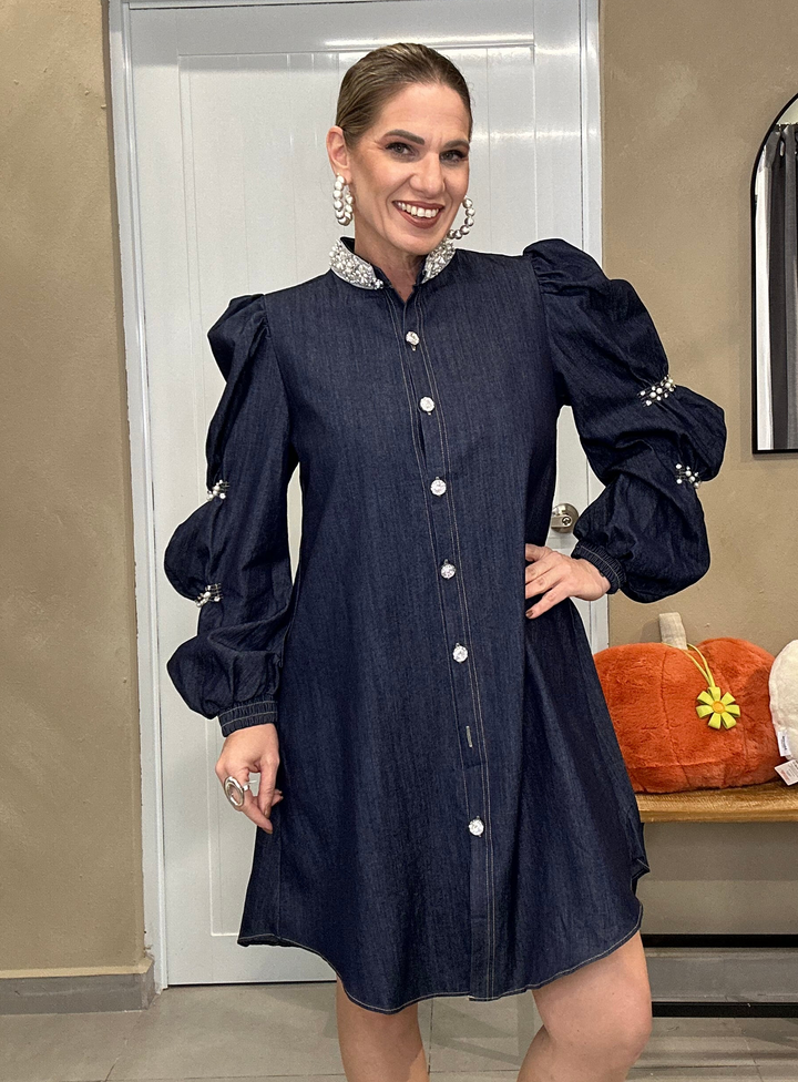 Traje corto confeccionado en mezclilla ligera, con mangas abullonadas y botones en plateado que realzan su elegancia. El cuello adornado con pedrería le da un toque glamuroso sin perder la sofisticación.