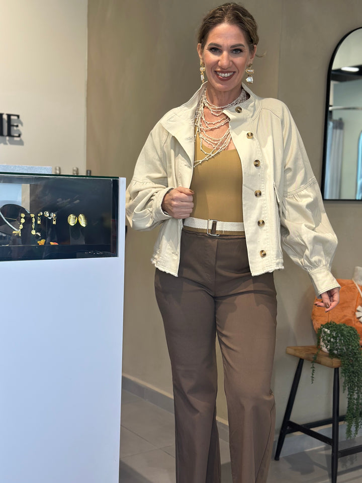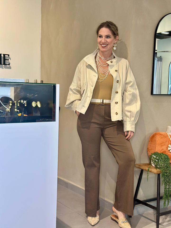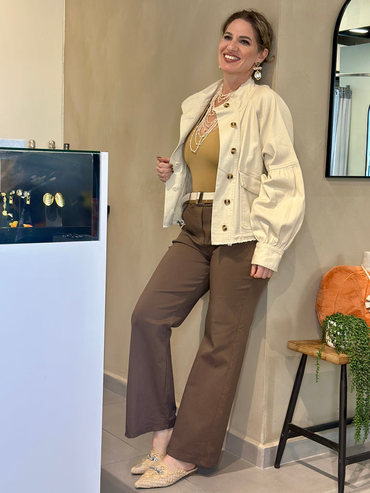 Perfecto para combinar con tops en tonos neutros o blusas de lino para un aire chic natural que se adapta del día a la noche.