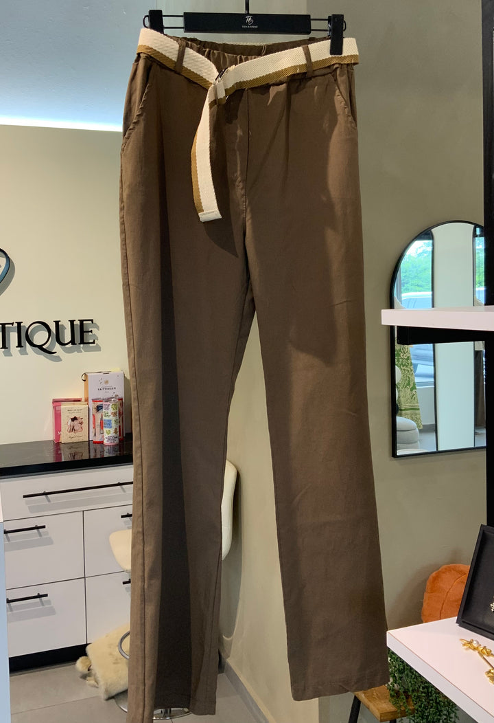 Pantalón italiano en tono marrón con cinturón texturizado en contraste, ideal para lograr un look relajado pero refinado. Confeccionado en una mezcla ligera tipo lino, ofrece comodidad y estilo gracias a su corte recto y cintura elástica posterior.