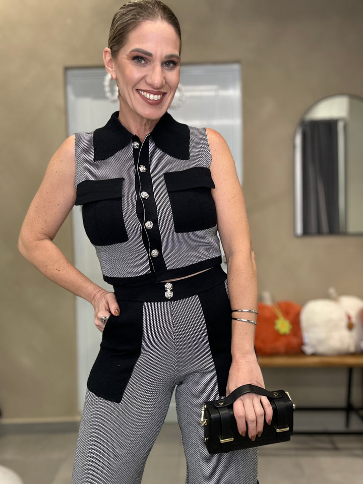 Set compuesto por crop top sin mangas y pantalón de pierna ancha en tejido estructurado con contraste en blanco y negro. Los botones joya y bolsillos decorativos elevan su diseño, aportando un aire sofisticado y moderno.