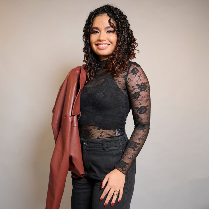Top de encaje negro translúcido con delicado diseño floral. De manga larga y cuello redondo, es una pieza versátil y elegante que aporta sensualidad y sofisticación a cualquier look. Ideal para llevar sobre un bralette o cami, creando combinaciones modernas tanto para la noche como para ocasiones especiales.
