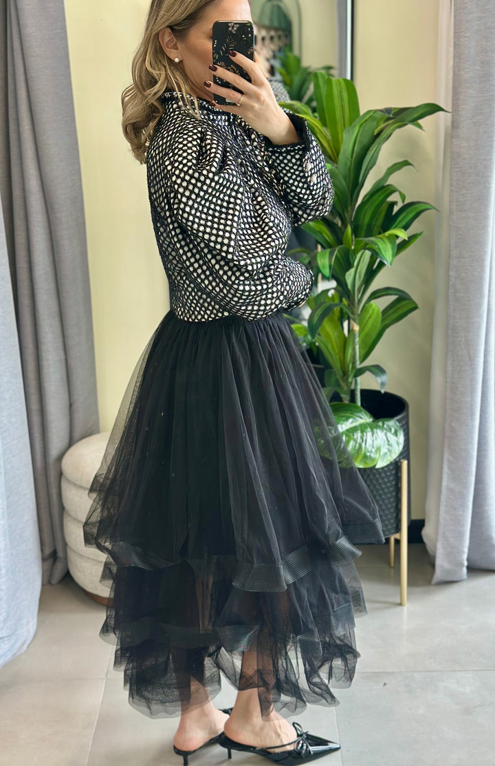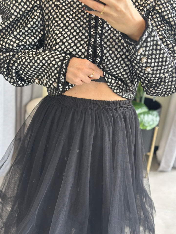 El tul superior es gris-negro con destellos plata y el bajo lleva una capa extra de tul negro brillante que refleja la luz como estrellas. Ligera pero con mucho cuerpo, perfecta para combinar con tops ajustados, camisas blancas, jerseys finos o botas altas.