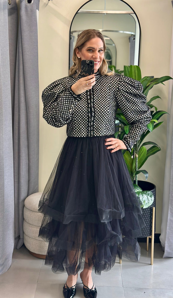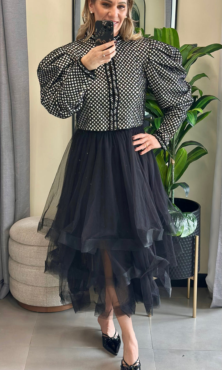La falda que convierte cualquier look en cuento de hadas oscuro. La Midnight Sparkle Tulle Skirt es pura magia: falda midi de tul negro con brillos plata incorporados, cintura alta elástica y tres capas de volantes asimétricos que crean movimiento y volumen espectacular.