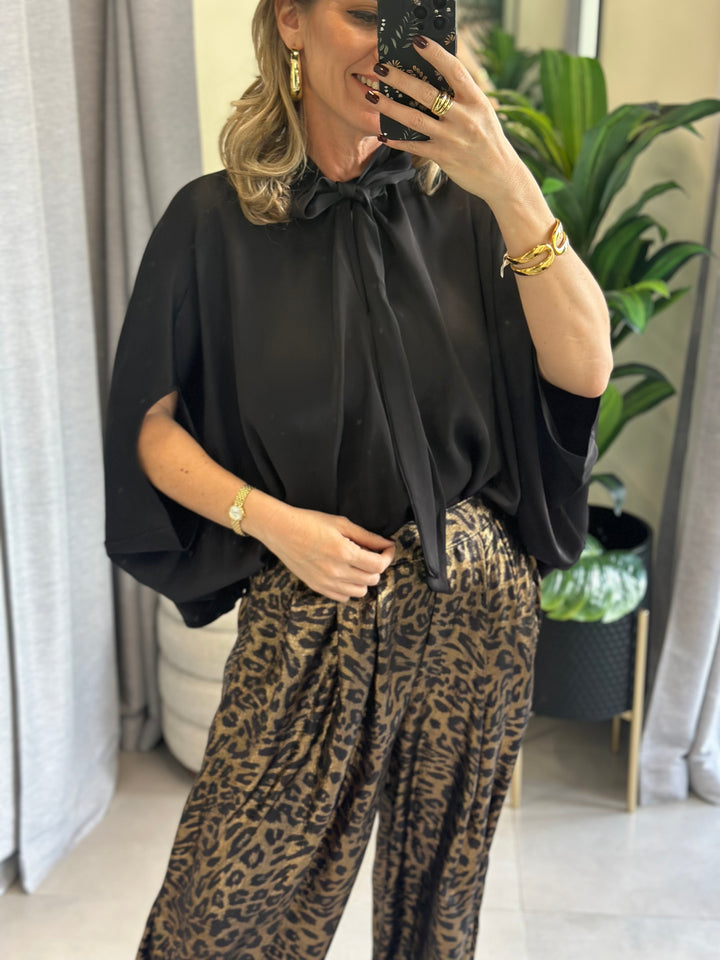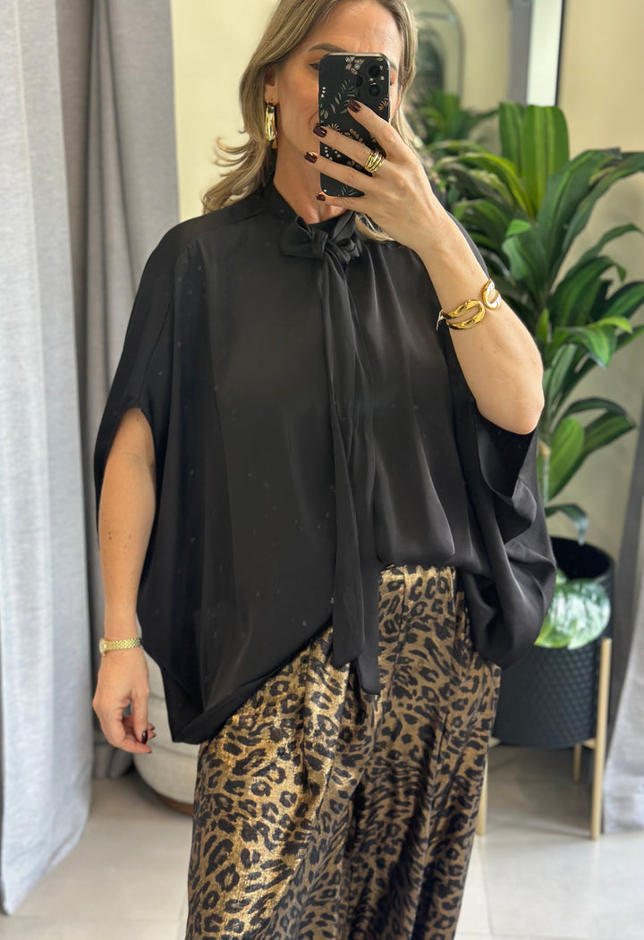 La blusa negra que nunca volverá a ser básica. La Obsidian Bow Drama Blouse es puro impacto minimal: corte amplio tipo kimono en crepé negro con brillo sutil, manga japonesa 3/4 y el detalle que la hace única: un escote en V profundo con dos grandes lazos negros que se anudan al cuello o se dejan caer con actitud.