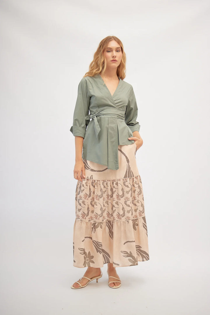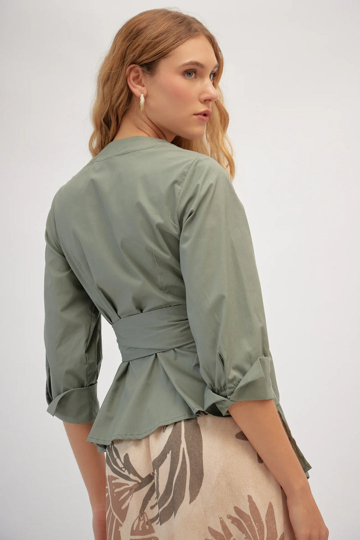 Blusa tipo wrap en tono verde oliva con lazo ajustable en la cintura que estiliza la silueta. Con mangas tres cuartos terminadas en puño, combina modernidad y elegancia minimalista. Confeccionada en Colombia, es una pieza versátil que puedes llevar tanto en un look de oficina como en una salida sofisticada.