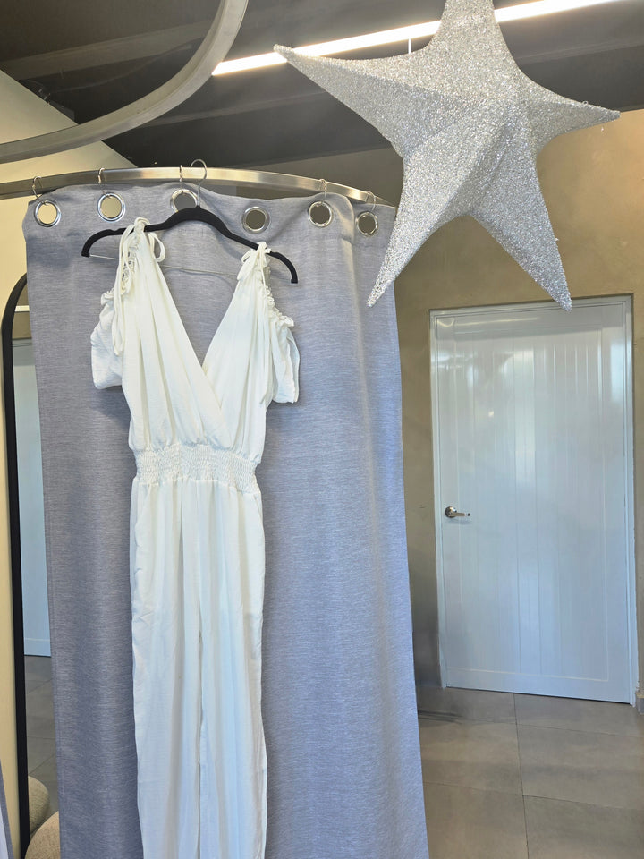 El Angel White Cold-Shoulder Jumpsuit es puro verano sofisticado: escote en V cruzado profundo, hombros descubiertos con detalle de lazos y volantes que caen como alas, cintura fruncida elástica que marca sin apretar y perneras ajustadas con puño tobillero.