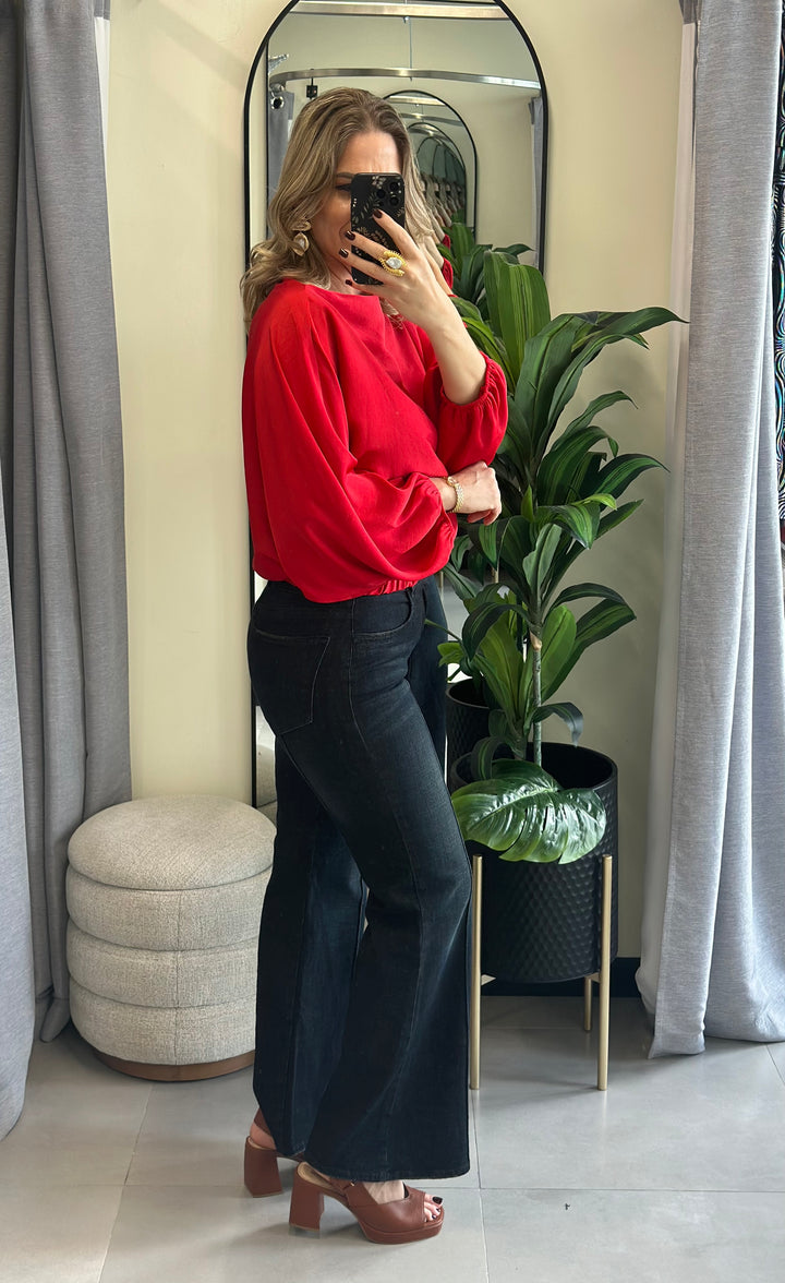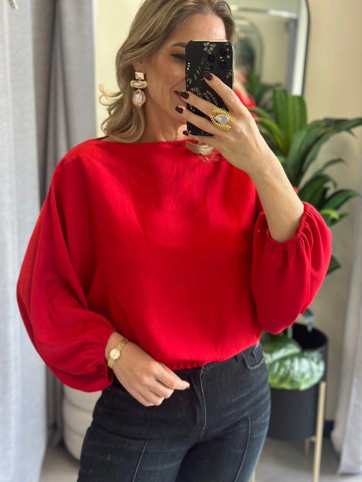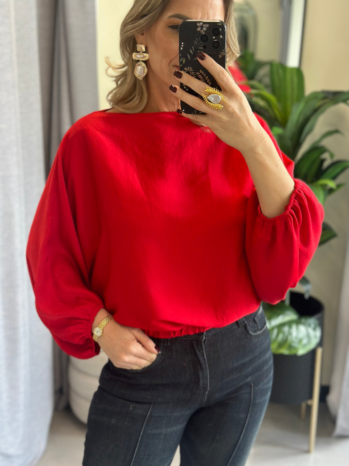 El rojo pasión que nunca pasa de moda. La Cherry Silk Bombshell Blouse es la blusa perfecta para brillar sin esfuerzo: corte amplio tipo murciélago en crepé de seda rojo cereza intenso, manga japonesa 3/4 y bajo elástico fruncido que crea un efecto peplum ultra favorecedor.