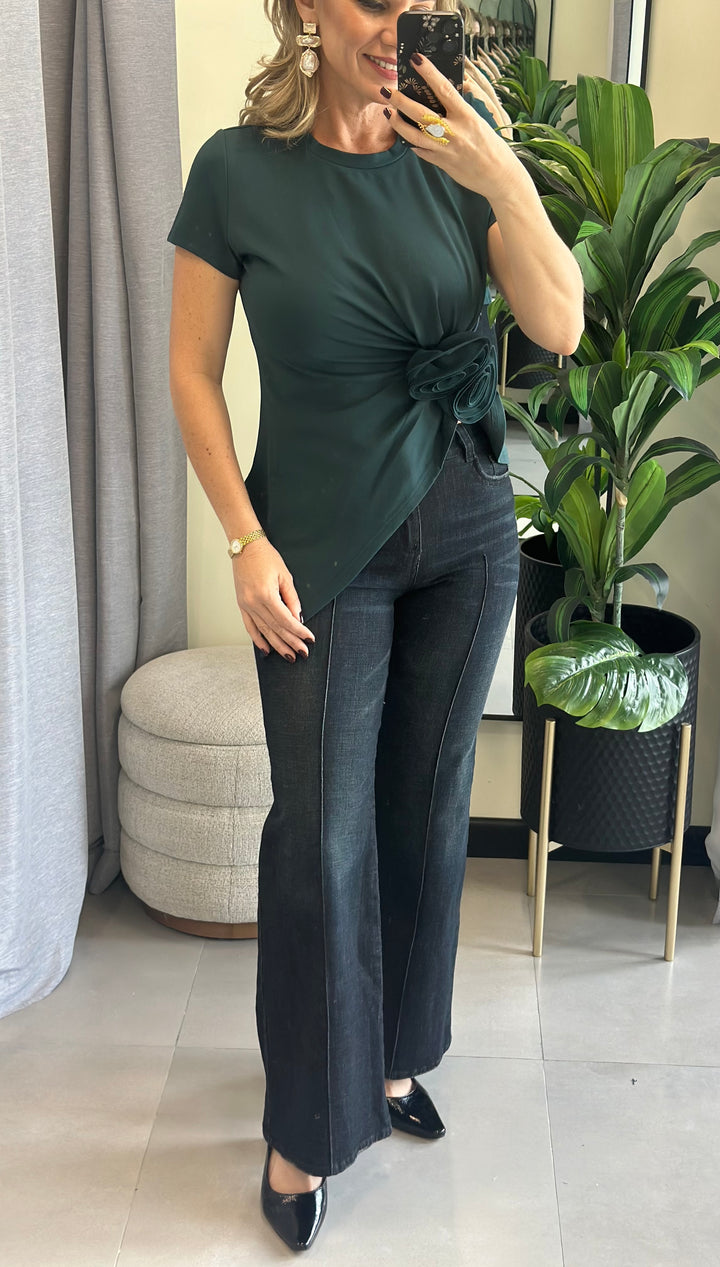 El detalle que lo cambia todo. La Rose Knot Emerald Top es un básico reinventado: camiseta cropped de algodón premium en un sofisticado verde esmeralda con una rosa 3D gigante hecha del mismo tejido que nace en el bajo y se enrolla sobre sí misma creando un efecto escultural y romántico.