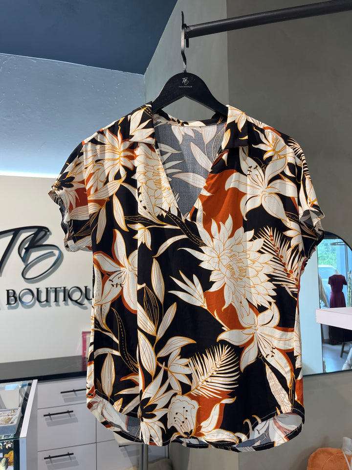 Blusa de la línea colombiana con estampado tropical en tonos tierra, mostaza y negro. Su textura ligera y caída fluida brindan un look sofisticado y natural, ideal para días cálidos o para combinar con piezas neutras que resalten su elegancia.