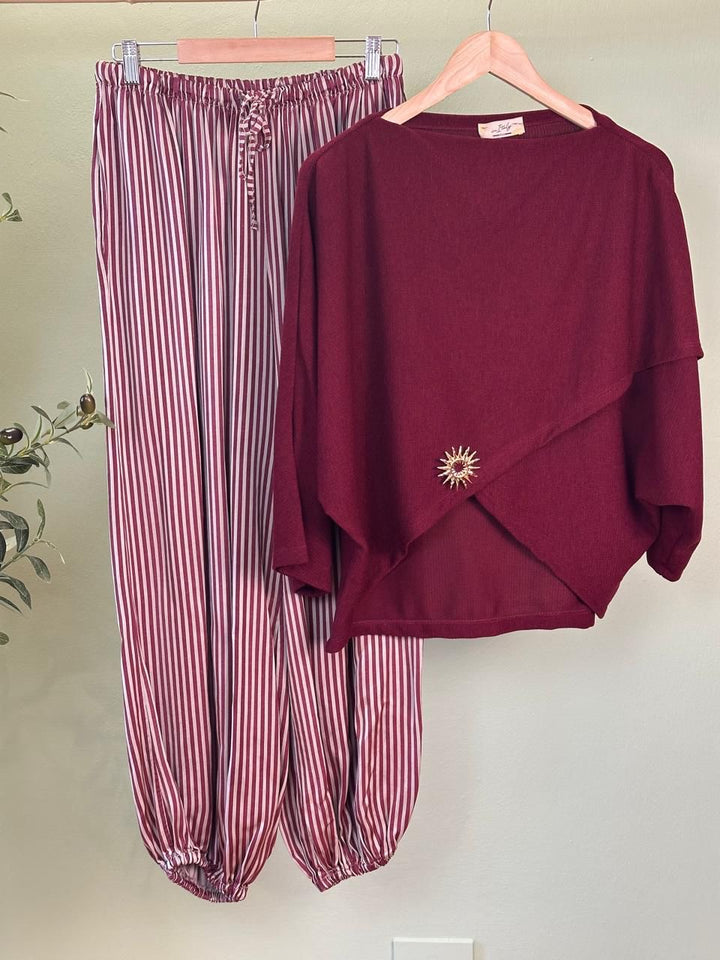 Pantalón amplio de estilo relajado con estampado de rayas verticales en tonos vino y crema. Su confección liviana y caída fluida aportan movimiento y comodidad, mientras que los tobillos elásticos crean una silueta moderna y favorecedora. Ideal para un look casual chic o combinado con una blusa estructurada para un contraste sofisticado.