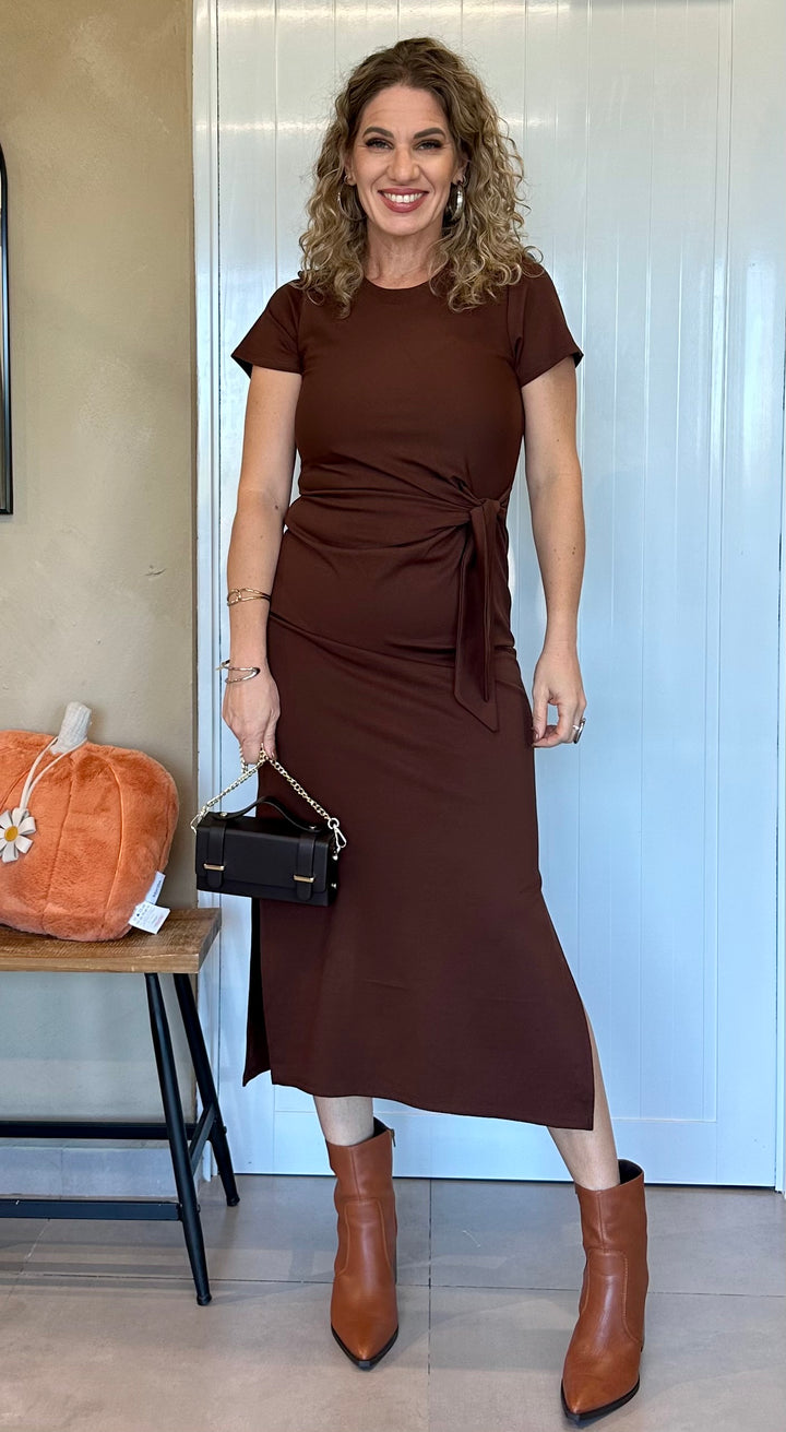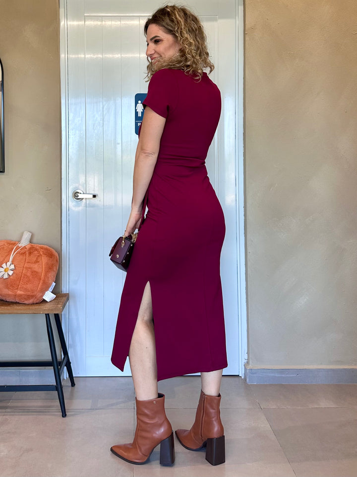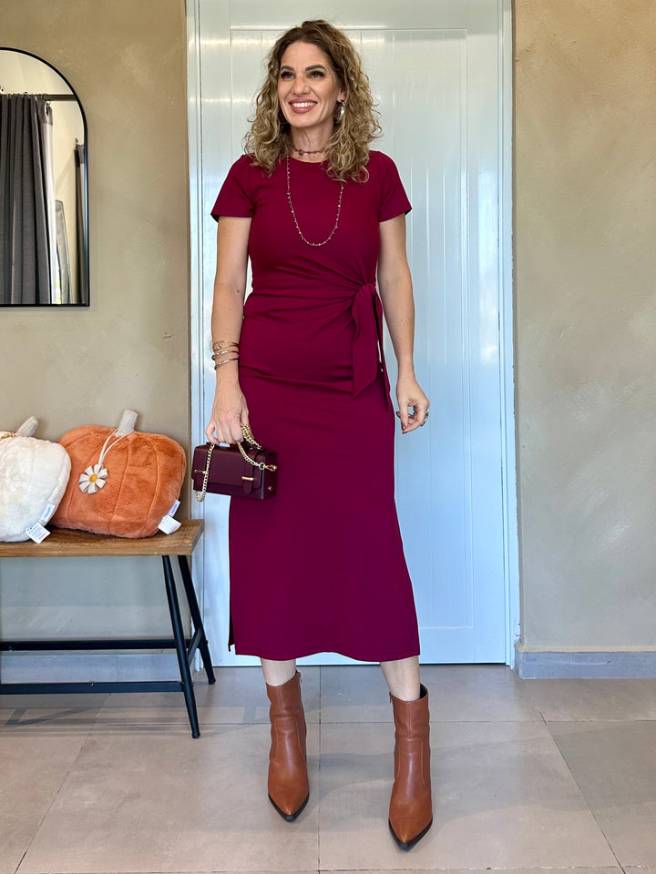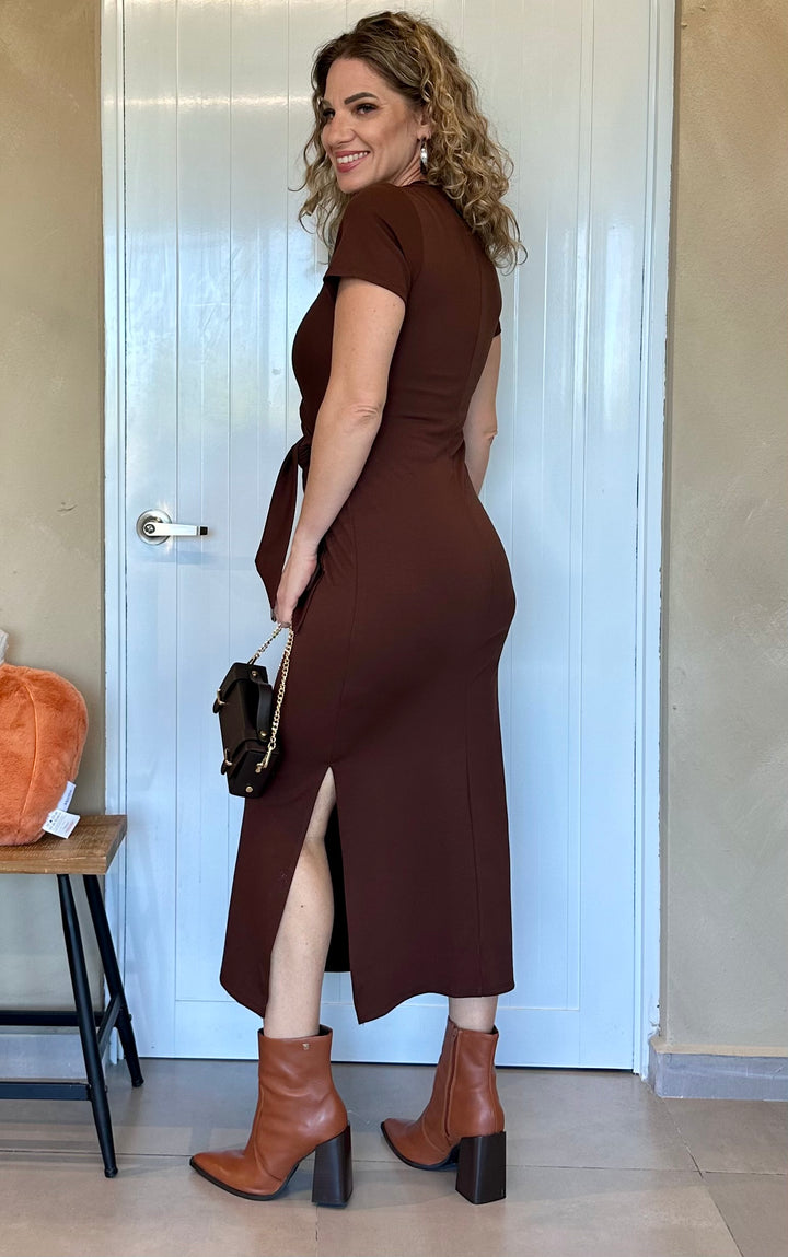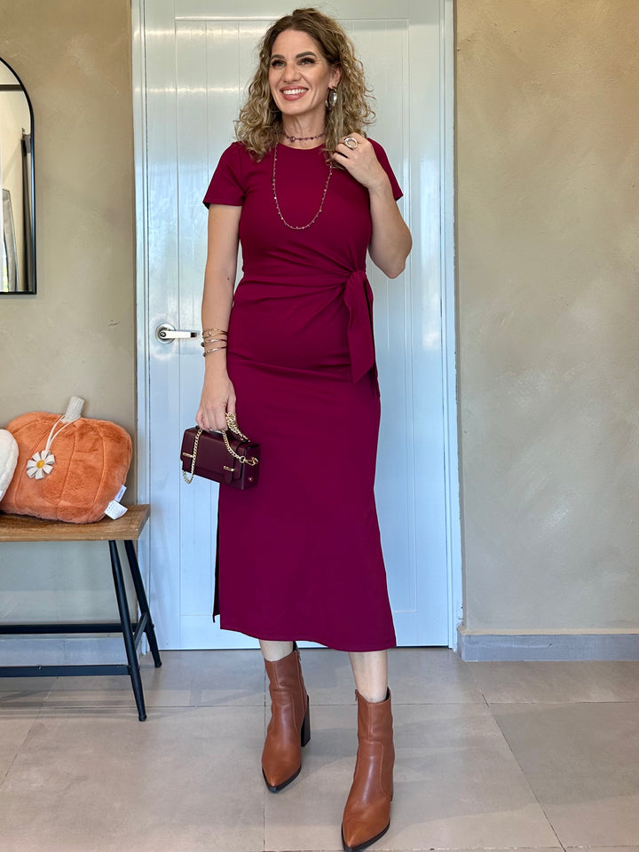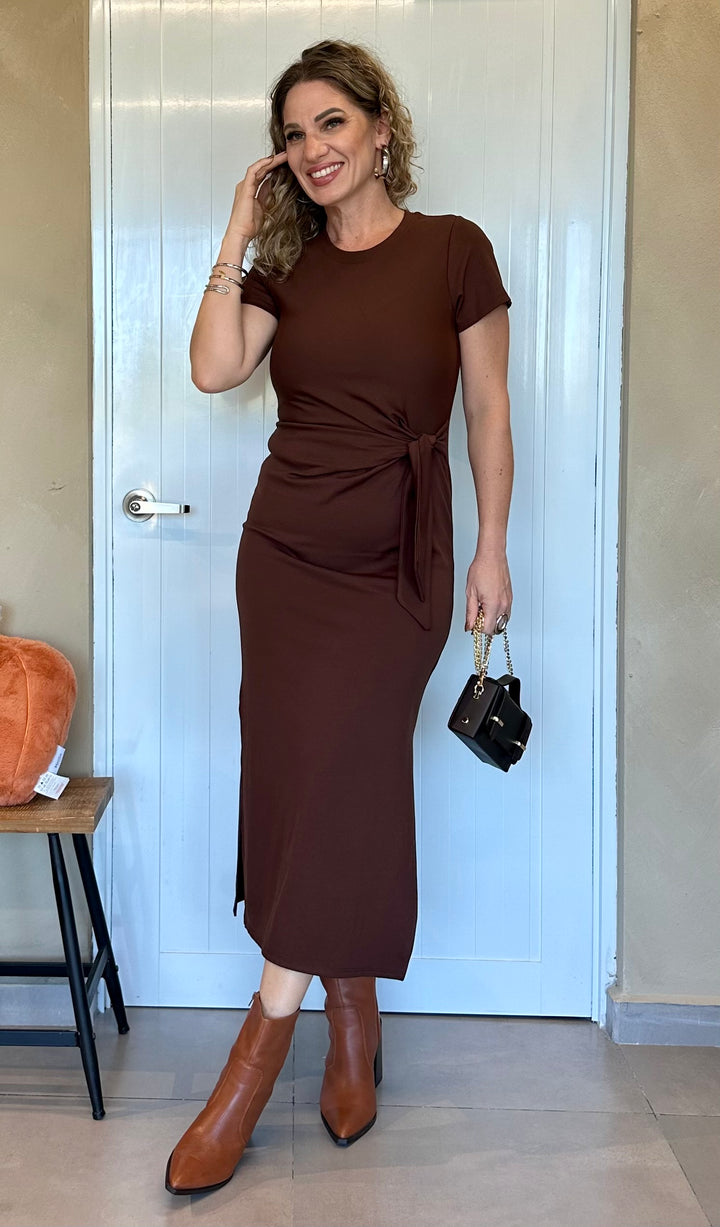 Vestido midi en tejido suave y elástico color chocolate intenso, con detalle de nudo lateral que estiliza la silueta. Mangas cortas y cuello redondo para un ajuste cómodo y femenino. Disponible también en un vibrante tono burgundy.