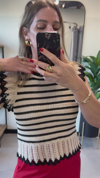 Top tejido a crochet sin mangas en vibrantes rayas horizontales beige y negro, con un diseño clásico y moderno al mismo tiempo. Cuenta con un delicado borde calado en forma de festón en blanco y negro que le da un toque romántico y femenino. Ideal para un look chic y fresco, perfecto para combinar con pantalones de color vivo como rojo o fucsia. Corre al size, se ajusta perfectamente al cuerpo marcando una silueta elegante y favorecedora. Modelo utiliza size small.
