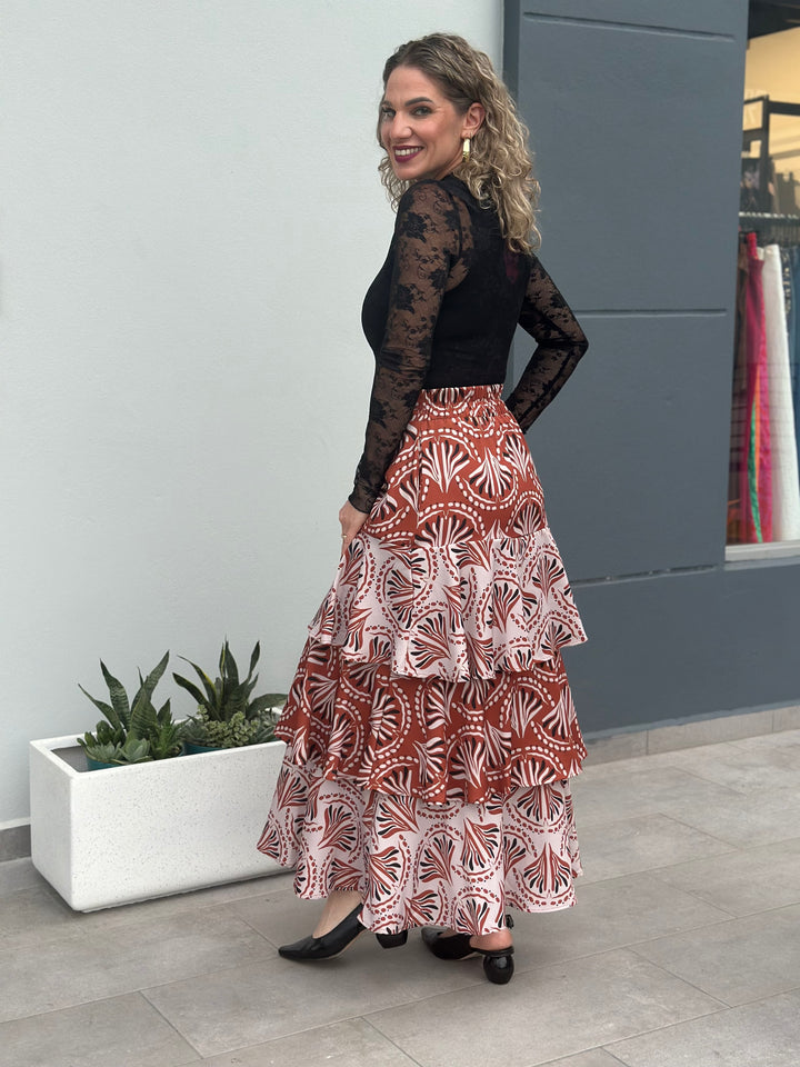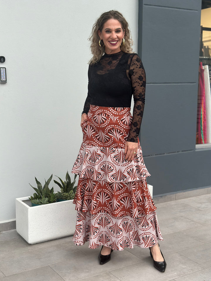 Falda colombiana de corte amplio con vuelos en capas, diseñada en un estampado terracota vibrante con motivos geométricos y orgánicos. Su silueta fluida aporta movimiento y frescura, convirtiéndola en una pieza ideal para destacar en ocasiones especiales o elevar un look casual con un toque sofisticado. Tiene faja en la parte frontal de la cintura y elástico en la parte trasera. No tiene zipper sube perfecto. Modelo luce small y mide 5’7”. Top interna y blusa en lace la consigues en el area de blusas.