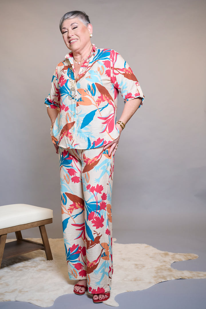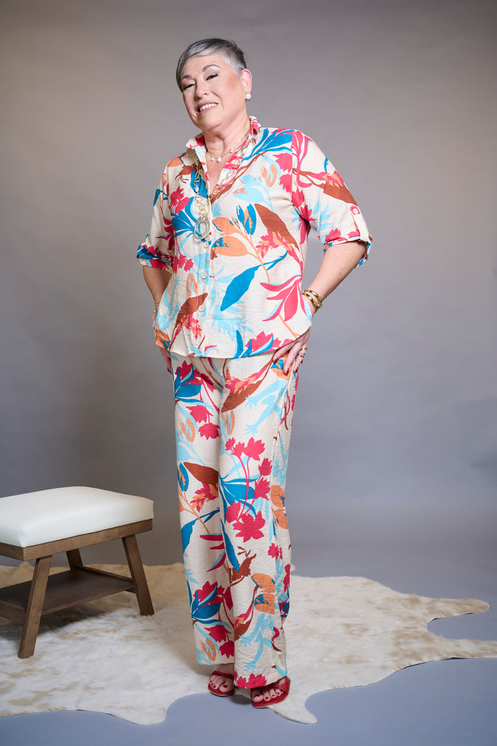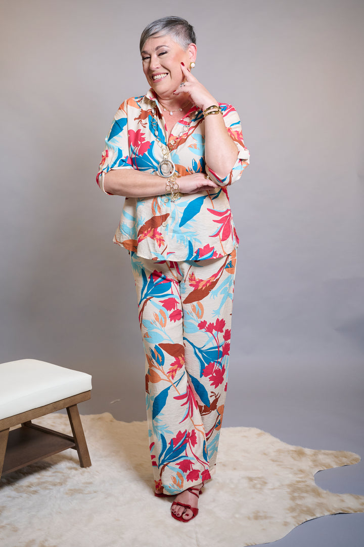 Set de camisa y palazzo en un vibrante estampado tropical de colores coral, fucsia, azul y naranja. Su tela ligera y fresca lo convierte en el conjunto ideal para días de verano o escapadas caribeñas, combinando comodidad con un estilo alegre y sofisticado. Perfecto para llevarlo junto o por separado y crear múltiples looks llenos de vida.