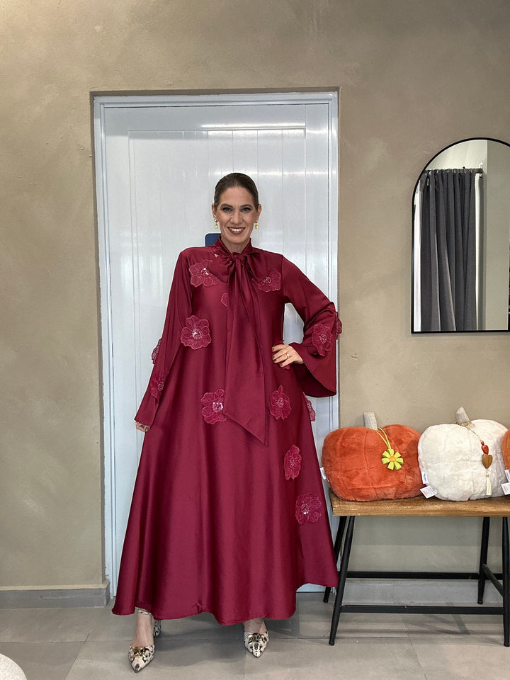 Un vestido largo en tono burgundy con aplicaciones florales bordadas que destacan por su elegancia y movimiento. El lazo al cuello le da un toque clásico y femenino, mientras que su corte amplio aporta fluidez y presencia. Perfecto para ocasiones especiales, cenas o eventos donde quieras irradiar sofisticación sin esfuerzo. Corre grande disponible hasta xl.
