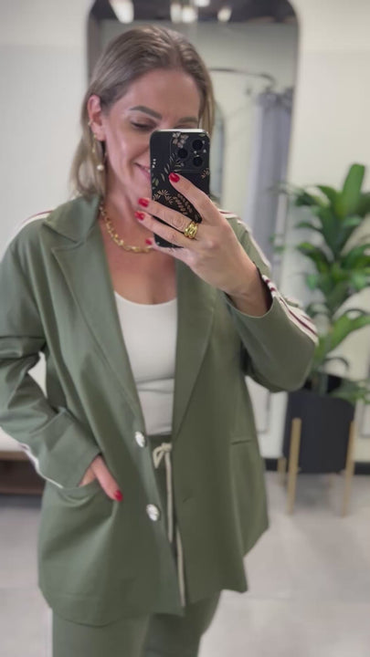 Este set combina comodidad y estilo en un diseño moderno ideal para el día a día. La chaqueta ligera con solapa y detalle de franjas en los hombros aporta un toque deportivo sin perder elegancia. El pantalón a juego crea un conjunto equilibrado que se ve pulido y relajado a la vez. Disponible en tres colores versátiles —beige, verde y café— se adapta fácilmente a cualquier guardarropa. Es perfecto para quienes buscan un look casual chic que funcione tanto para salir como para estar cómoda durante la jornada.