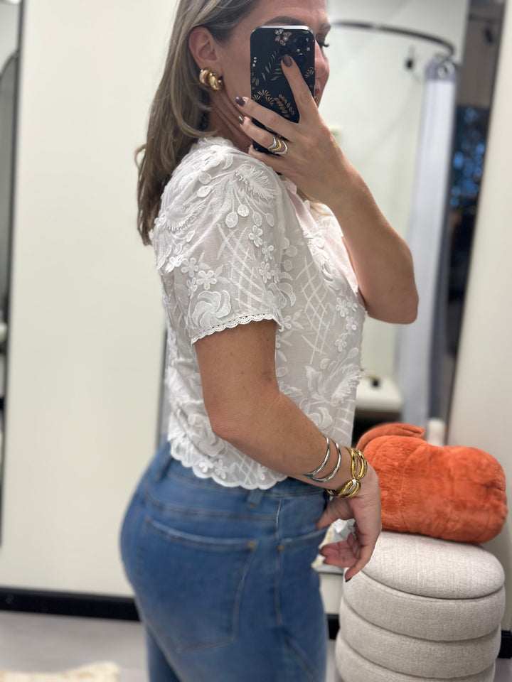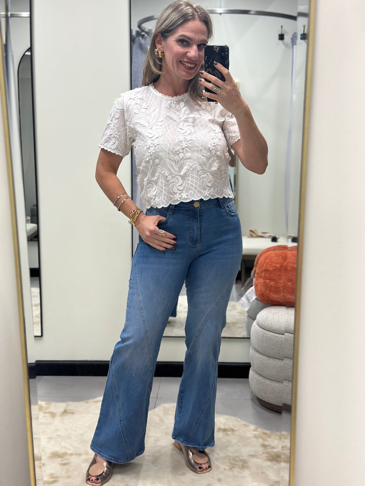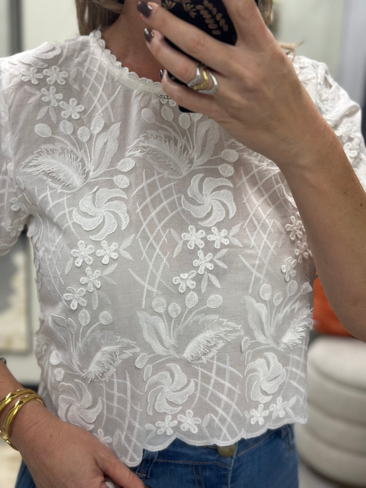 Blusa corta blanca con bordados florales y detalles en relieve que le aportan un aire romántico y femenino. Confeccionada en Colombia, combina frescura y elegancia en una pieza exclusiva que nunca pasa de moda.